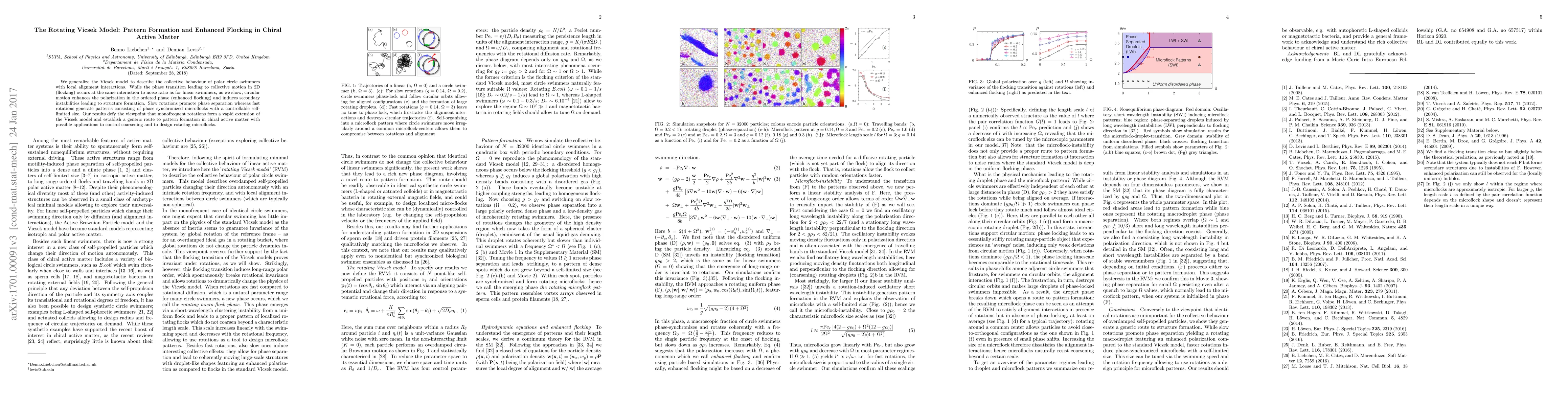 We generalize the Vicsek model to describe the collective behaviour of polar circle swimmers with local alignment interactions. While the phase transition leading to collective motion in 2D (flocking) occurs at the same interaction to noise ratio as for linear swimmers, as we show, circular motion enhances the polarization in the ordered phase (enhanced flocking) and induces secondary instabilities leading to structure formation. Slow rotations result in phase separation whereas fast rotations generate patterns which consist of phase synchronized microflocks of controllable self-limited size. Our results defy the viewpoint that monofrequent rotations form a rather trivial extension of the Vicsek model and establish a generic route to pattern formation in chiral active matter with possible applications to control coarsening and to design rotating microflocks.