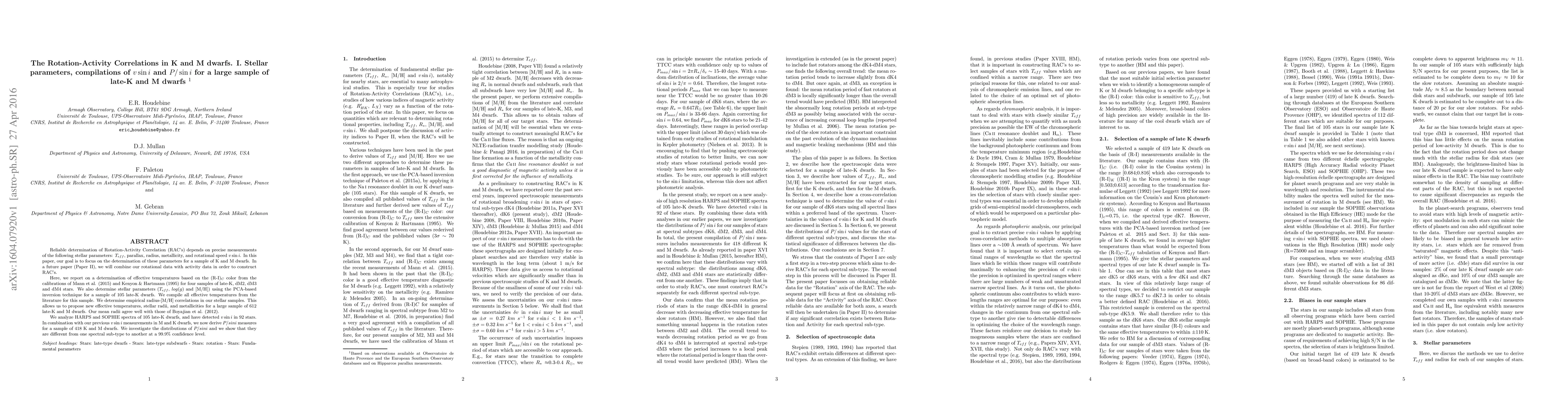 Reliable determination of Rotation-Activity Correlation (RAC's) depends on precise measurements of the following stellar parameters: $T_{eff}$, parallax, radius, metallicity, and rotational speed $v\sin i$. In this paper, our goal is to focus on the determination of these parameters for a sample of K and M dwarfs. In a future paper (Paper II), we will combine our rotational data with activity data in order to construct RAC's. Here, we report on a determination of effective temperatures based on the (R-I)$_C$ color from the calibrations of Mann et al. (2015) and Kenyon \& Hartmann (1995) for four samples of late-K, dM2, dM3 and dM4 stars. We also determine stellar parameters ($T_{eff}$, $log(g)$ and [M/H]) using the PCA-based inversion technique for a sample of 105 late-K dwarfs. We compile all effective temperatures from the literature for this sample. We determine empirical radius-[M/H] correlations in our stellar samples. This allows us to propose new effective temperatures, stellar radii, and metallicities for a large sample of 612 late-K and M dwarfs. Our mean radii agree well with those of Boyajian et al. (2012). We analyze HARPS and SOPHIE spectra of 105 late-K dwarfs, and have detected $v\sin i$ in 92 stars. In combination with our previous $v\sin i$ measurements in M and K dwarfs, we now derive $P/sin i$ measures for a sample of 418 K and M dwarfs. We investigate the distributions of $P/sin i$ and we show that they are different from one spectral sub-type to another at a 99.9\% confidence level.