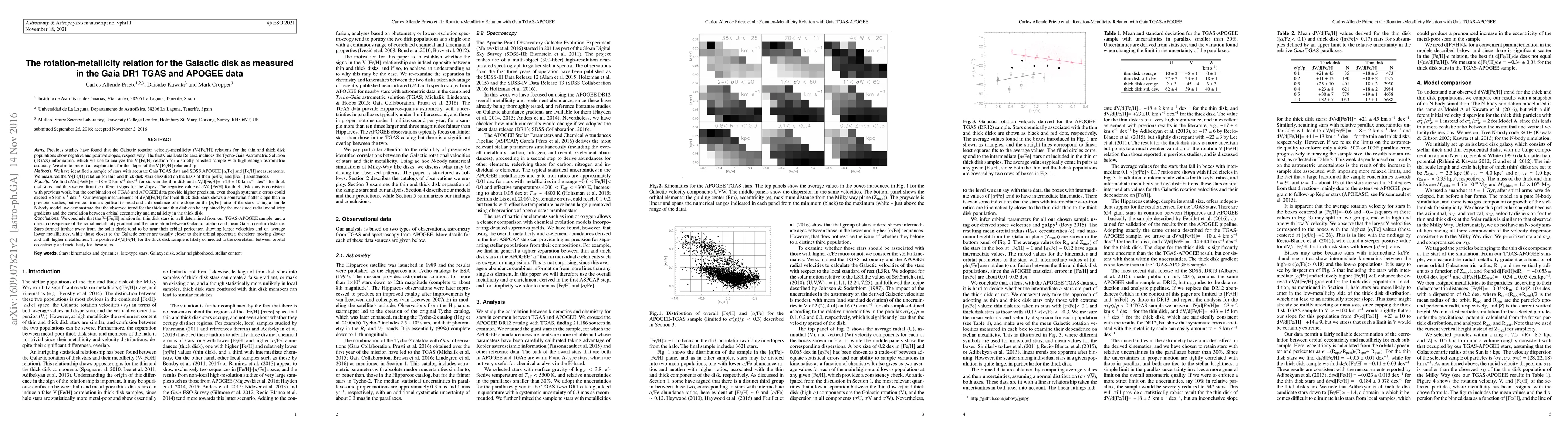 This study analyzes the rotation-metallicity relation (V-[Fe/H]) in the Galactic disk using Gaia DR1 TGAS and APOGEE data, confirming different slopes for thin and thick disk stars: -18 +/- 2 km/s/dex and +23 +/- 10 km/s/dex respectively. The findings suggest a dependence on the [alpha/Fe] ratio and support a model explaining the trends through radial metallicity gradients and orbital eccentricity correlations.