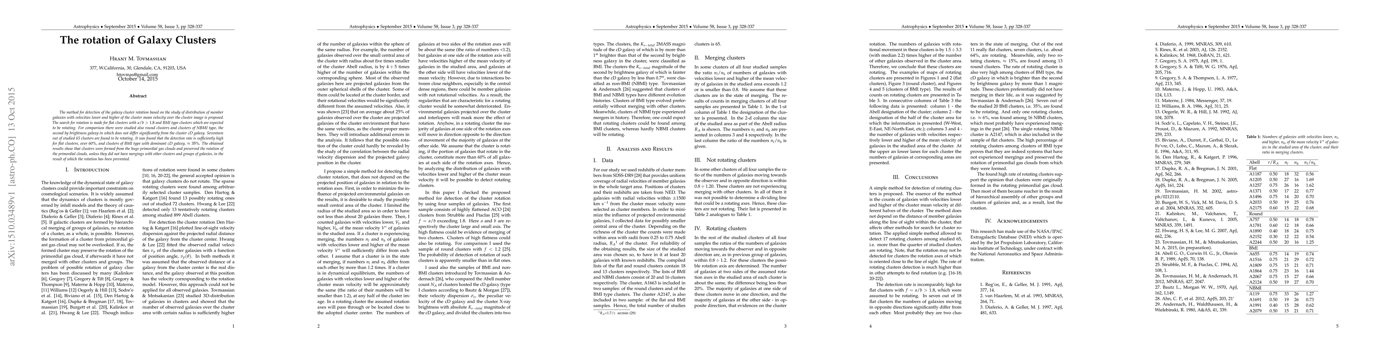 Researchers proposed a method to detect galaxy cluster rotation based on member galaxy velocity distribution, finding 17 out of 65 clusters rotate. The detection rate is high for flat clusters and those with dominant central galaxies.