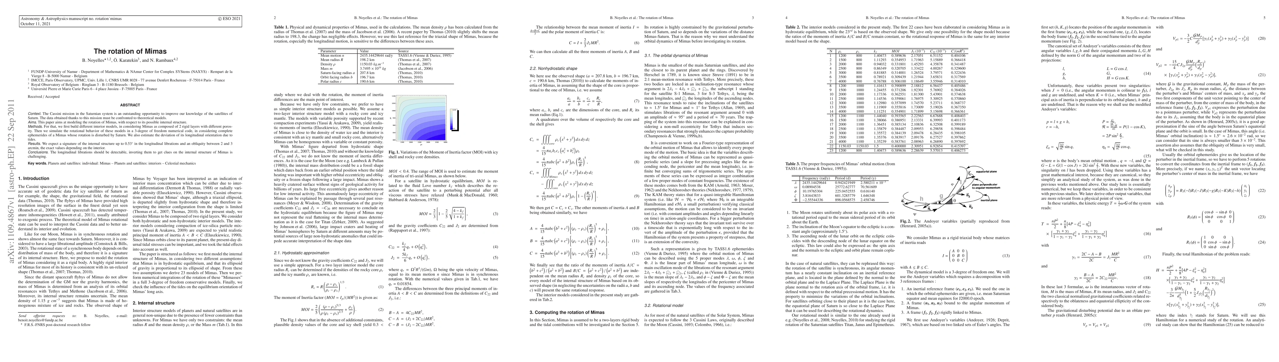 The Cassini mission in the Saturnian system is an outstanding opportunity to improve our knowledge of the satellites of Saturn. The data obtained thanks to this mission must be confronted to theoretical models. This paper aims at modeling the rotation of Mimas, with respect to its possible internal structure. For that, we first build different interior models, in considering Mimas as composed of 2 rigid layers with different porosity. Then we simulate the rotational behavior of these models in a 3-degree of freedom numerical code, in considering complete ephemerides of a Mimas whose rotation is disturbed by Saturn. We also estimate the deviation of its longitudinal orientation due to tides. We expect a signature of the internal structure up to 0.53{\deg} in the longitudinal librations and an obliquity between 2 and 3 arcmin, the exact values depending on the interior. The longitudinal librations should be detectable, inverting them to get clues on the internal structure of Mimas is challenging.
