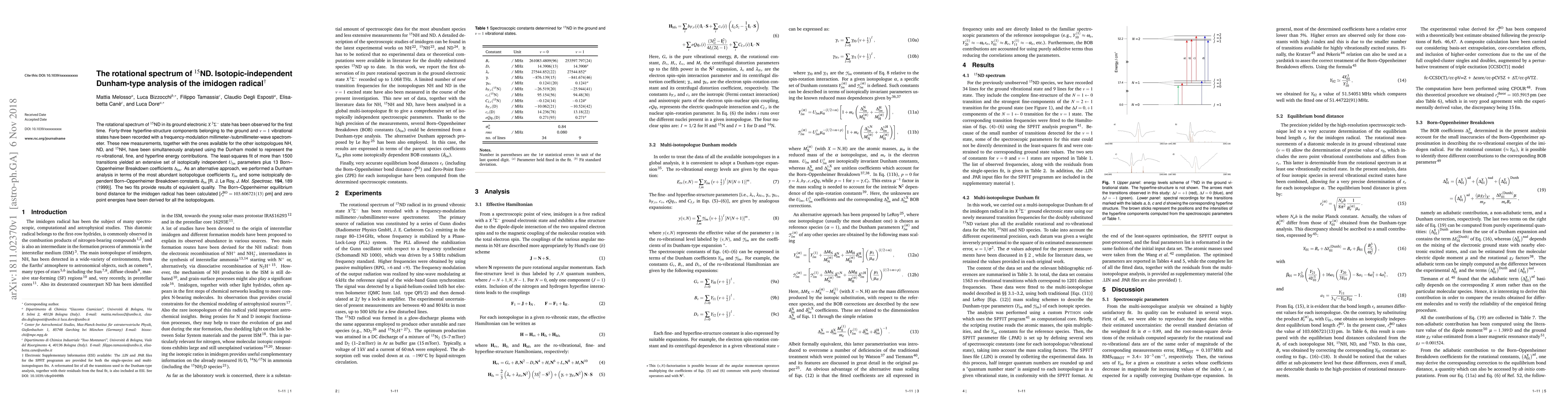 The rotational spectrum of $^{15}$ND in its ground electronic $X^{3}\Sigma^{-}$ state has been observed for the first time. Forty-three hyperfine-structure components belonging to the ground and v = 1 vibrational states have been recorded with a frequency-modulation millimeter-/submillimeter-wave spectrometer. These new measurements, together with the ones available for the other isotopologues NH, ND, and $^{15}$NH, have been simultaneously analysed using the Dunham model to represent the ro-vibrational, fine, and hyperfine energy contributions. The least-squares fit of more than 1500 transitions yielded an extensive set of isotopically independent $U_{lm}$ parameters plus 13 Born--Oppenheimer Breakdown coefficients $\Delta_{lm}$. As an alternative approach, we performed a Dunham analysis in terms of the most abundant isotopologue coefficients $Y_{lm}$ and some isotopically dependent Born--Oppenheimer Breakdown constants $\delta_{lm}$ [R. J. Le Roy, J. Mol. Spectrosc. 194, 189 (1999)]. The two fits provide results of equivalent quality. The Born--Oppenheimer equilibrium bond distance for the imidogen radical has been calculated [$r_e^{BO}$ =103.606721(13) pm] and zero point energies have been derived for all the isotopologues.