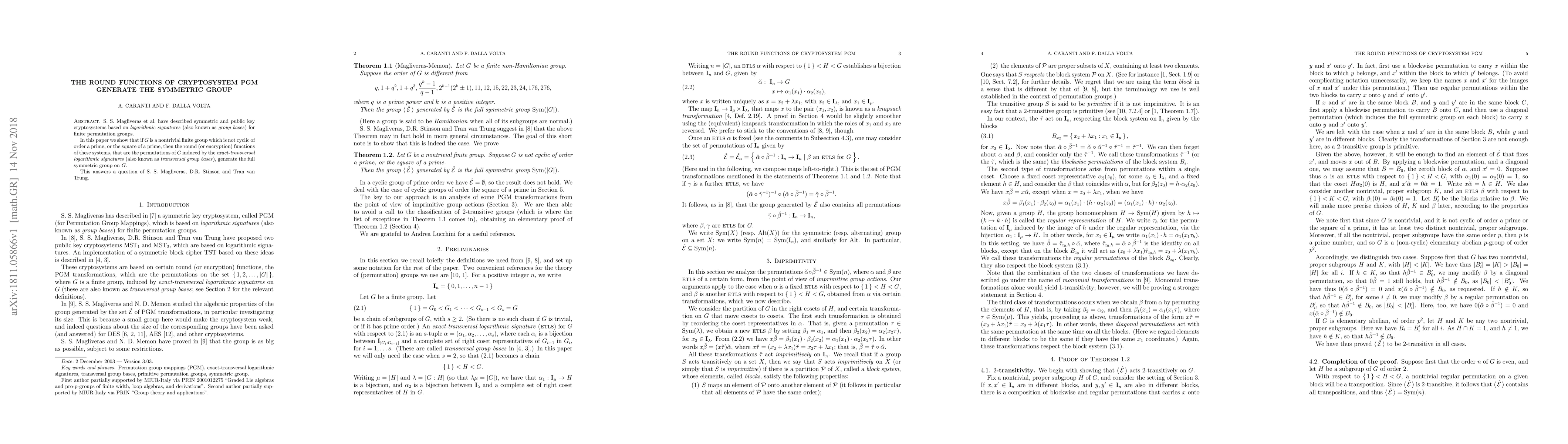S. S. Magliveras et al. have described symmetric and public key cryptosystems based on logarithmic signatures (also known as group bases) for finite permutation groups. In this paper we show that if $G$ is a nontrivial finite group which is not cyclic of order a prime, or the square of a prime, then the round (or encryption) functions of these systems, that are the permutations of $G$ induced by the exact-transversal logarithmic signatures (also known as transversal group bases), generate the full symmetric group on $G$. This answers a question of S. S. Magliveras, D.R. Stinson and Tran van Trung.
