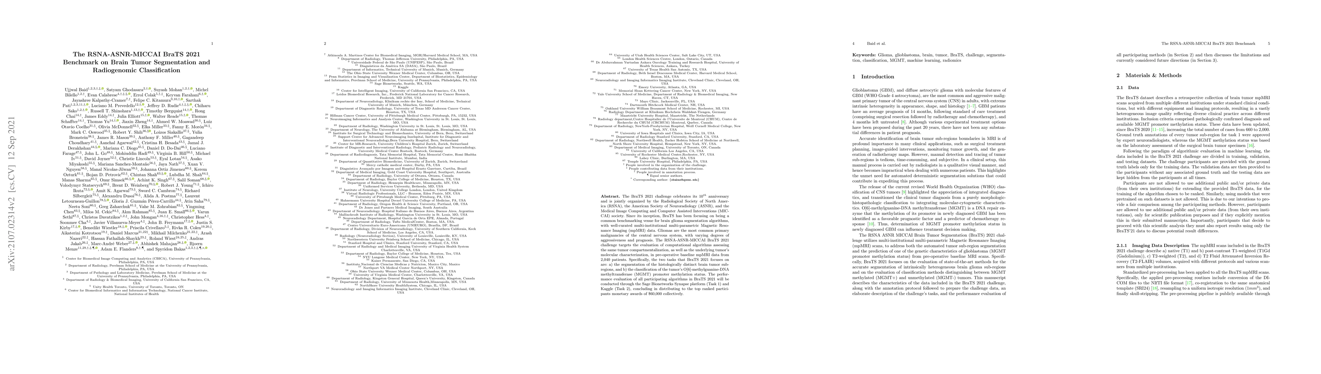 The RSNA-ASNR-MICCAI BraTS 2021 challenge evaluates computational algorithms for brain tumor segmentation and radiogenomic classification using multi-institutional MRI data from 2,040 patients. The challenge focuses on segmenting distinct brain tumor sub-regions and classifying MGMT promoter methylation status, with top performers receiving $60,000 in awards.