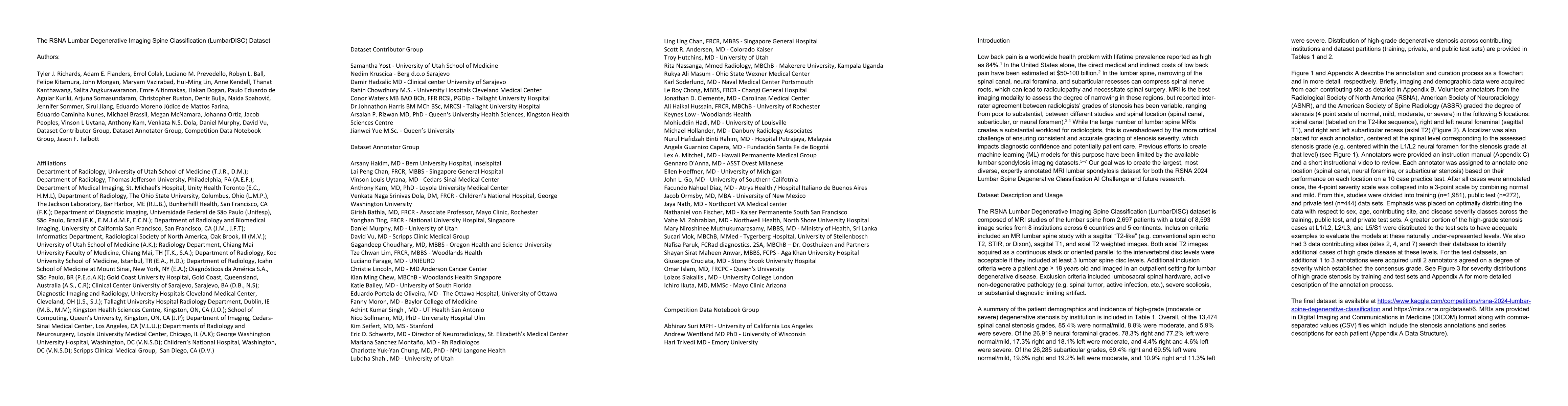 The RSNA Lumbar Degenerative Imaging Spine Classification dataset is a large, publicly available MRI dataset of adult lumbar spine exams annotated for degenerative changes. It aims to facilitate research and development in machine learning and lumbar spine imaging.