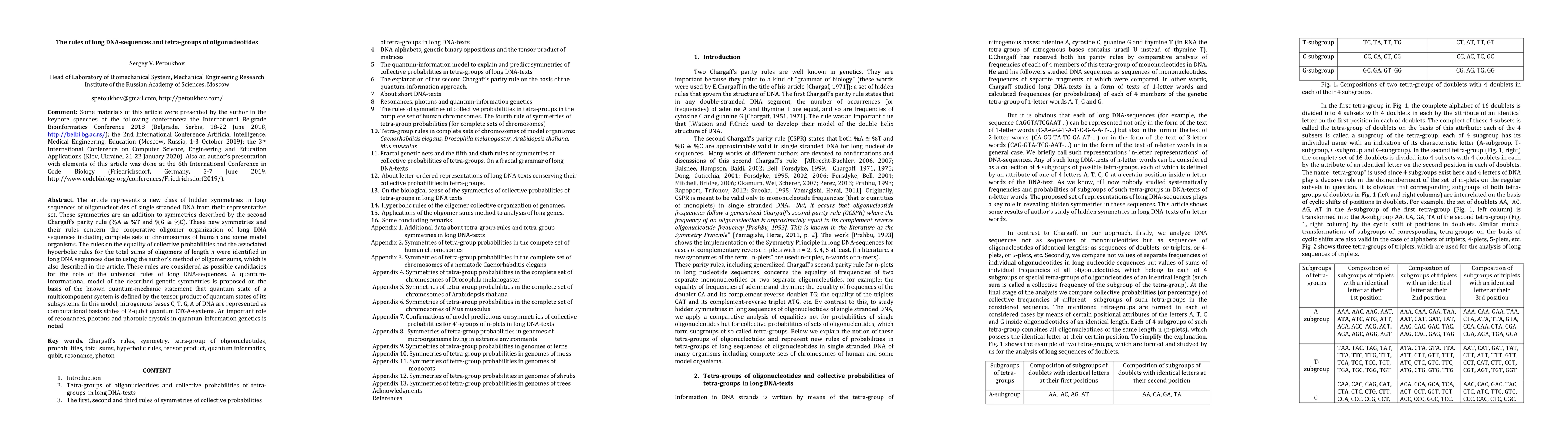 The article represents a new class of hidden symmetries in long sequences of oligonucleotides of single stranded DNA from their representative set. These symmetries are an addition to symmetries described by the second parity rule of Chargaff. These new symmetries and their rules concern collective probabilities of oligonucleotides from special tetra-groups and their subgroups in long DNA-texts including complete sets of chromosomes of human and some model organisms. These rules of tetra-group probabilities are considered as possible candidacies for the role of universal rules of long DNA-sequences. A quantum-informational model of genetic symmetries of these collective probabilities is proposed on the basis of the known quantum-mechanic statement that quantum state of a multicomponent system is defined by the tensor product of quantum states of its subsystems. In this model, nitrogenous bases C, T, G, A of DNA are represented as computational basis states of 2-qubit quantum CTGA-systems. The biological meaning of these new quantum-information symmetries of long DNA texts is associated with the common ability of all living organisms to grow and develop on the basis of incorporation into their body of new and new molecules of nutrients becoming new quantum-mechanic subsystems of the united quantum-mechanic organism. An important role of resonances, photons and photonic crystals in quantum information genetics is noted.