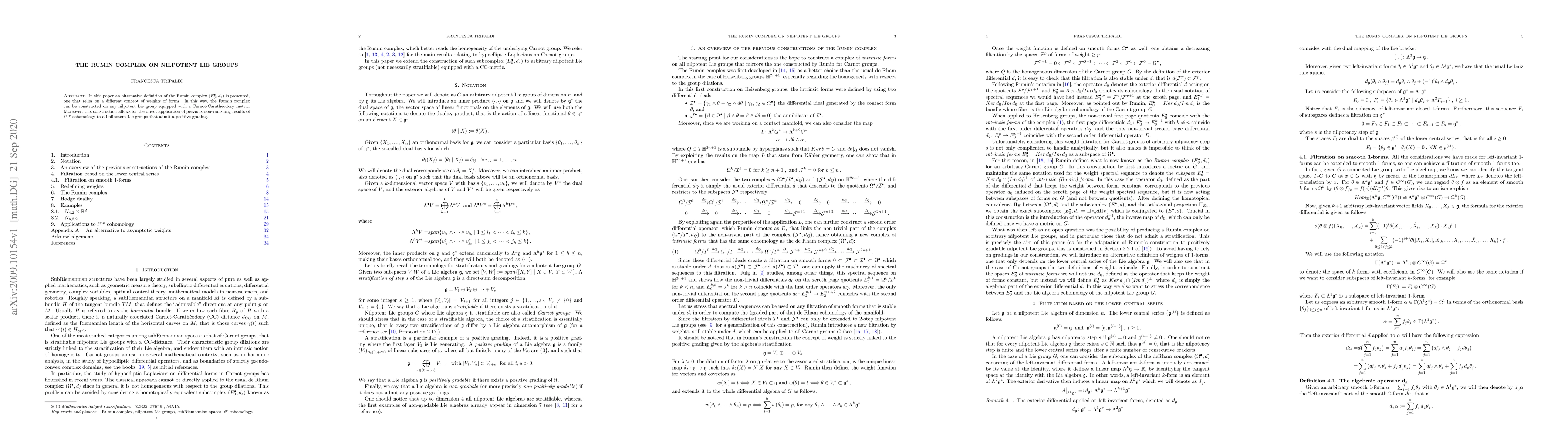 The paper introduces a novel method for defining and constructing the Rumin complex on nilpotent Lie groups using a different concept of weights for forms, enabling its application to a broader class of groups and facilitating the use of existing non-vanishing cohomology results.