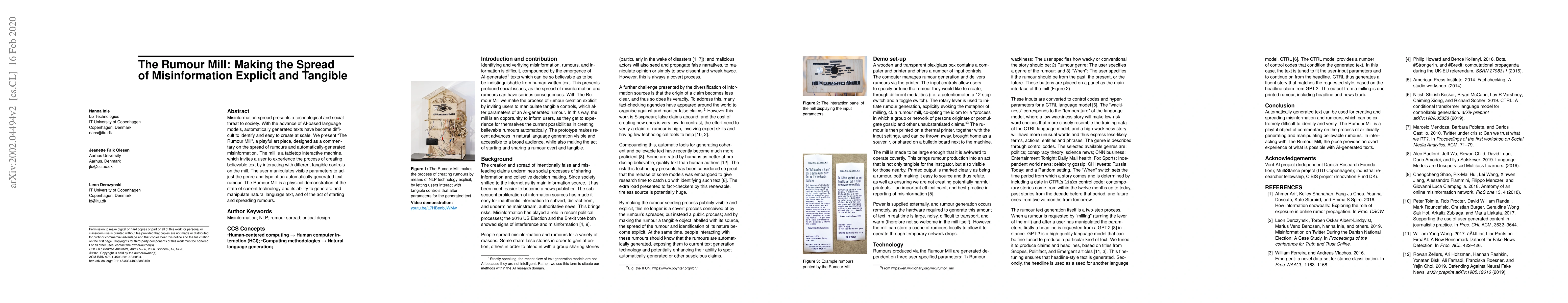 Misinformation spread presents a technological and social threat to society. With the advance of AI-based language models, automatically generated texts have become difficult to identify and easy to create at scale. We present "The Rumour Mill", a playful art piece, designed as a commentary on the spread of rumours and automatically-generated misinformation. The mill is a tabletop interactive machine, which invites a user to experience the process of creating believable text by interacting with different tangible controls on the mill. The user manipulates visible parameters to adjust the genre and type of an automatically generated text rumour. The Rumour Mill is a physical demonstration of the state of current technology and its ability to generate and manipulate natural language text, and of the act of starting and spreading rumours.