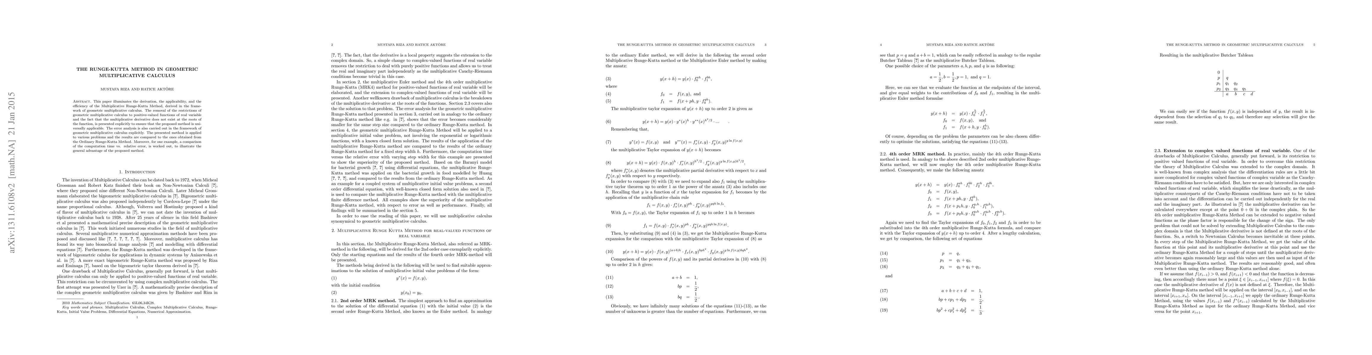 This paper illuminates the derivation, the applicability, and the efficiency of the Multiplicative Runge-Kutta Method, derived in the frame- work of geometric multiplicative calculus. The removal of the restrictions of geometric multiplicative calculus to positive-valued functions of real variable and the fact that the multiplicative derivative does not exist at the roots of the function, is presented explicitly to ensure that the proposed method is uni- versally applicable. The error analysis is also carried out in the framework of geometric multiplicative calculus explicitly. The presented method is applied to various problems and the results are compared to the ones obtained from the Ordinary Runge-Kutta Method. Moreover, for one example, a comparison of the computation time vs. relative error, is worked out, to illustrate the general advantage of the proposed method.