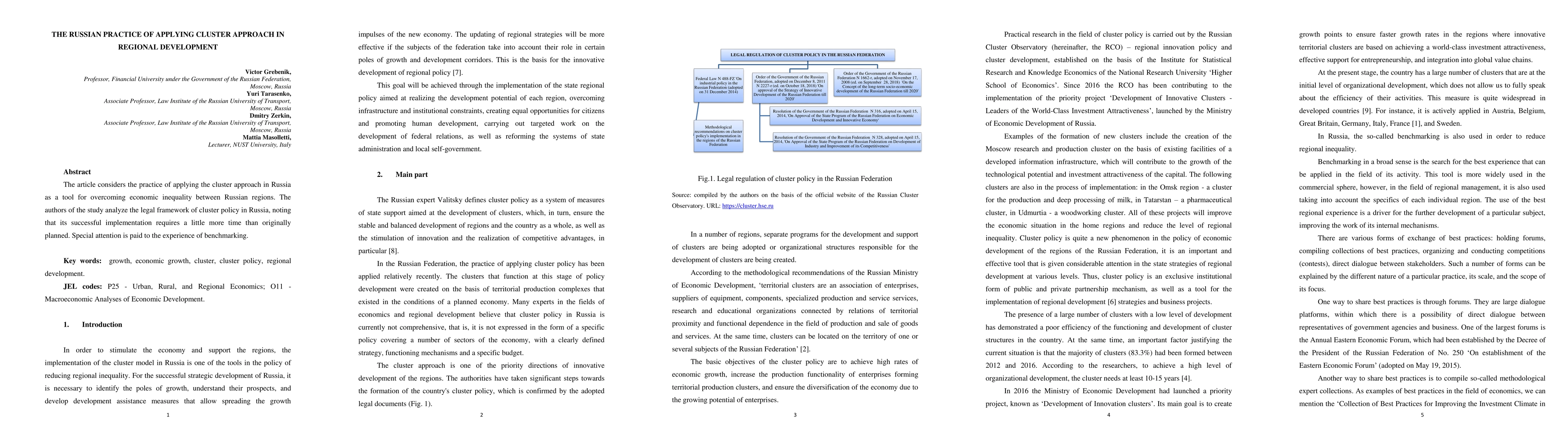 The article considers the practice of applying the cluster approach in Russia as a tool for overcoming economic inequality between Russian regions. The authors of the study analyze the legal framework of cluster policy in Russia, noting that its successful implementation requires a little more time than originally planned. Special attention is paid to the experience of benchmarking.