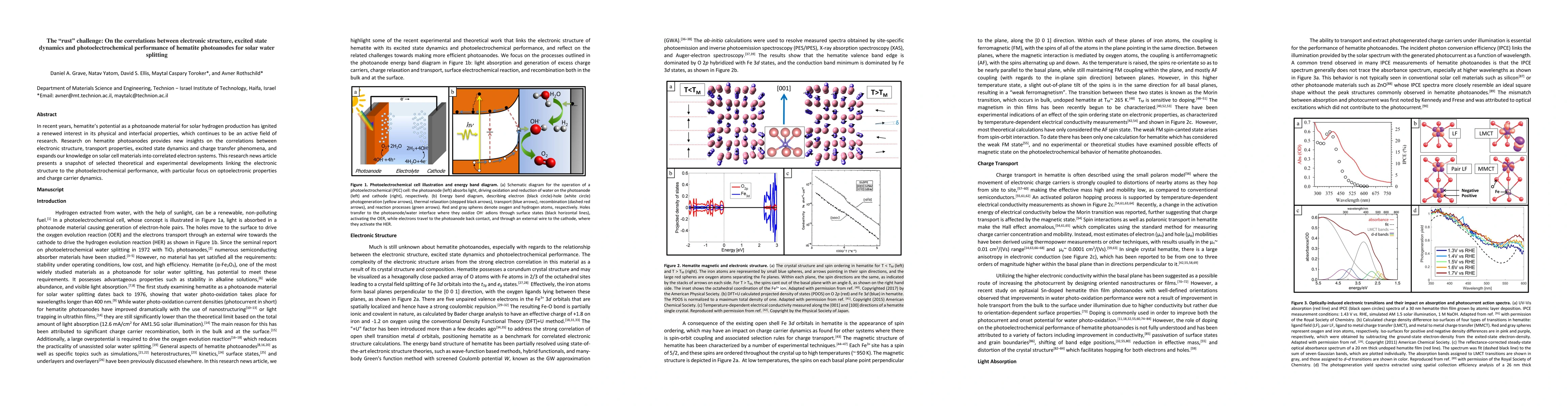This research paper explores the correlations between electronic structure, excited state dynamics, and photoelectrochemical performance of hematite photoanodes for solar water splitting. It highlights recent theoretical and experimental advancements linking these factors to improve understanding of charge carrier dynamics and optoelectronic properties in hematite.