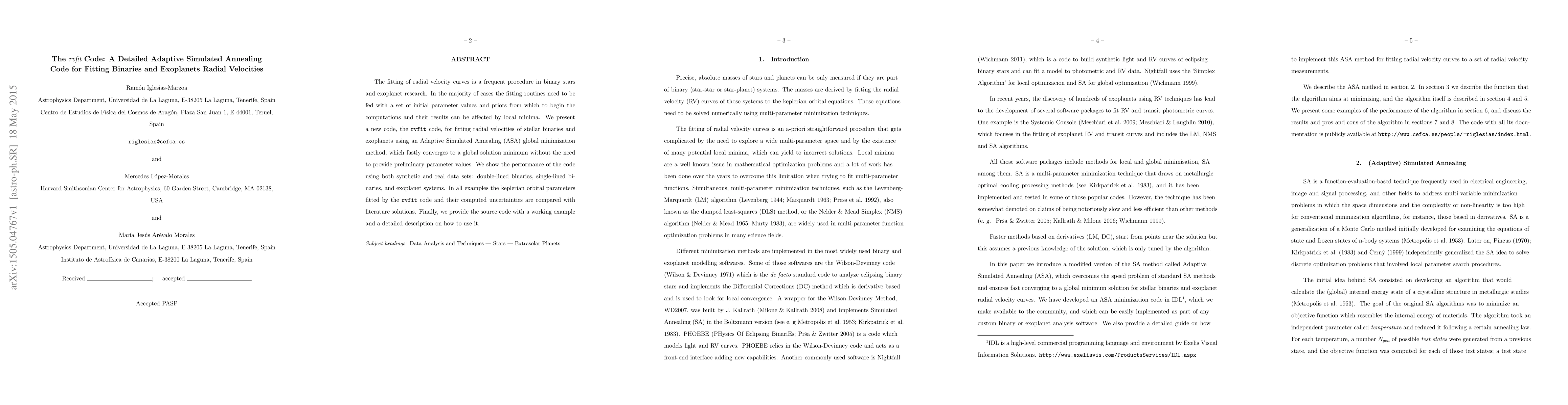 The fitting of radial velocity curves is a frequent procedure in binary stars and exoplanet research. In the majority of cases the fitting routines need to be fed with a set of initial parameter values and priors from which to begin the computations and their results can be affected by local minima. We present a new code, the rvfit code, for fitting radial velocities of stellar binaries and exoplanets using an Adaptive Simulated Annealing (ASA) global minimization method, which fastly converges to a global solution minimum without the need to provide preliminary parameter values. We show the performance of the code using both synthetic and real data sets: double-lined binaries, single-lined binaries, and exoplanet systems. In all examples the keplerian orbital parameters fitted by the rvfit code and their computed uncertainties are compared with literature solutions. Finally, we provide the source code with a working example and a detailed description on how to use it.