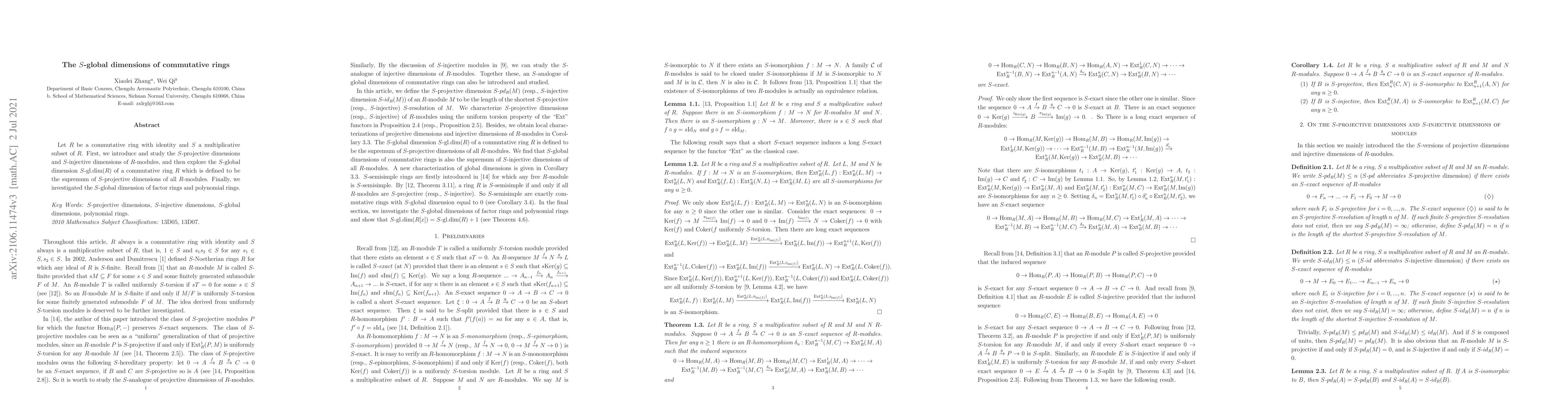 Let $R$ be a commutative ring with identity and $S$ a multiplicative subset of $R$. First, we introduce and study the $S$-projective dimensions and $S$-injective dimensions of $R$-modules, and then explore the $S$-global dimension $S$-gl.dim$(R)$ of a commutative ring $R$ which is defined to be the supremum of $S$-projective dimensions of all $R$-modules. Finally, we investigated the $S$-global dimension of factor rings and polynomial rings.