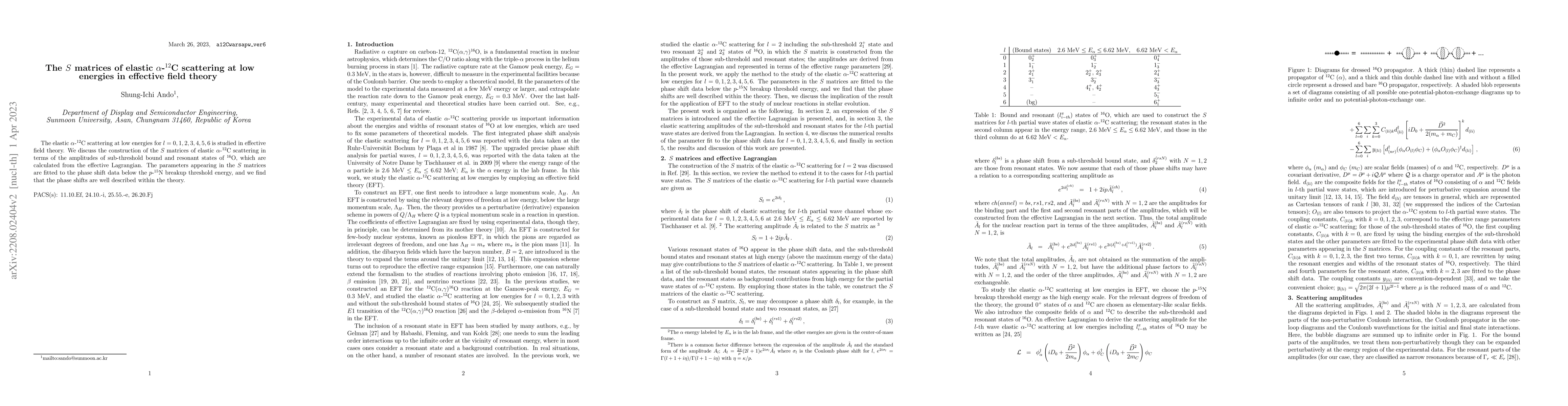 This paper investigates the elastic $\alpha$-$^{12}$C scattering at low energies using effective field theory, constructing $S$ matrices from sub-threshold bound and resonant states of $^{16}$O. The fitted parameters align well with phase shift data below the $p$-$^{15}$N breakup threshold, demonstrating the theory's accuracy.