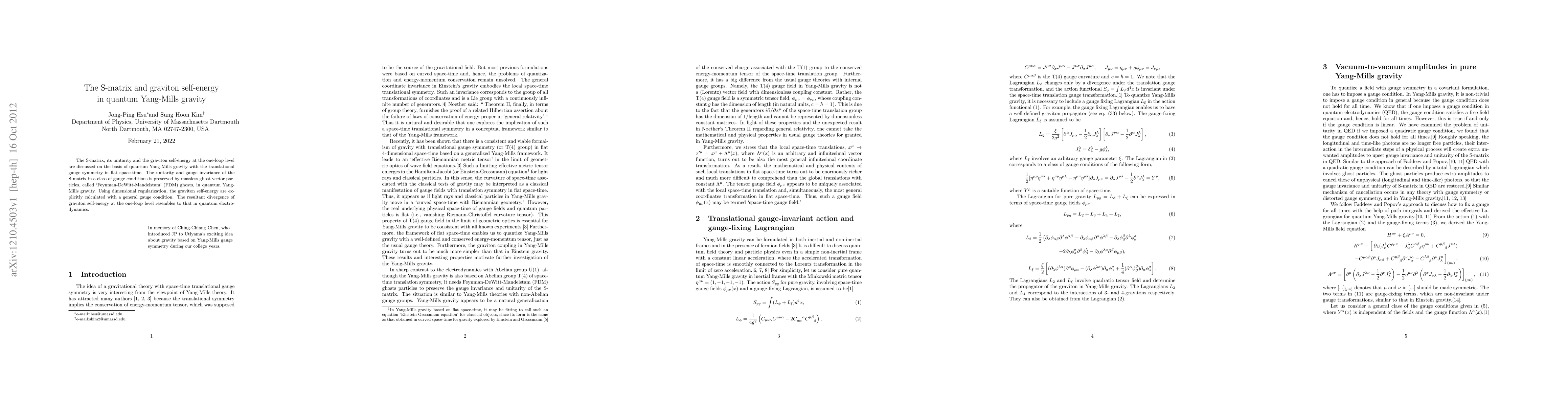 The S-matrix, its unitarity and the graviton self-energy at the one-loop level are discussed on the basis of quantum Yang-Mills gravity with the translational gauge symmetry in flat space-time. The unitarity and gauge invariance of the S-matrix in a class of gauge conditions is preserved by massless ghost vector particles, called `Feynman-DeWitt-Mandelstam' (FDM) ghosts, in quantum Yang-Mills gravity. Using dimensional regularization, the graviton self-energy are explicitly calculated with a general gauge condition. The resultant divergence of graviton self-energy at the one-loop level resembles to that in quantum electrodynamics.