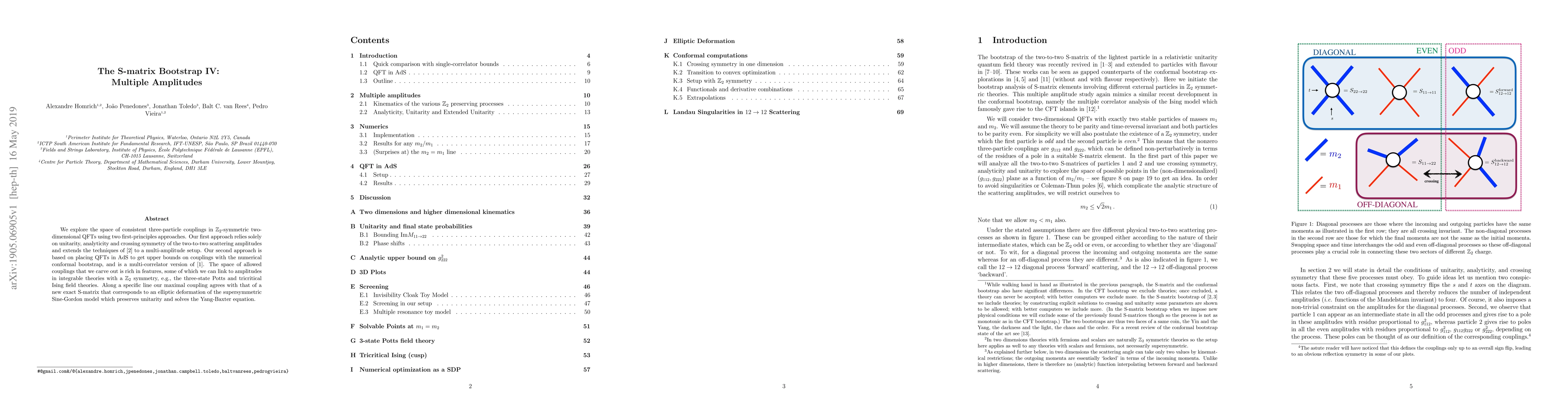 We explore the space of consistent three-particle couplings in $\mathbb Z_2$-symmetric two-dimensional QFTs using two first-principles approaches. Our first approach relies solely on unitarity, analyticity and crossing symmetry of the two-to-two scattering amplitudes and extends the techniques of [arXiv:1607.06110] to a multi-amplitude setup. Our second approach is based on placing QFTs in AdS to get upper bounds on couplings with the numerical conformal bootstrap, and is a multi-correlator version of [arXiv:1607.06109]. The space of allowed couplings that we carve out is rich in features, some of which we can link to amplitudes in integrable theories with a $\mathbb Z_2$ symmetry, e.g., the three-state Potts and tricritical Ising field theories. Along a specific line our maximal coupling agrees with that of a new exact S-matrix that corresponds to an elliptic deformation of the supersymmetric Sine-Gordon model which preserves unitarity and solves the Yang-Baxter equation.