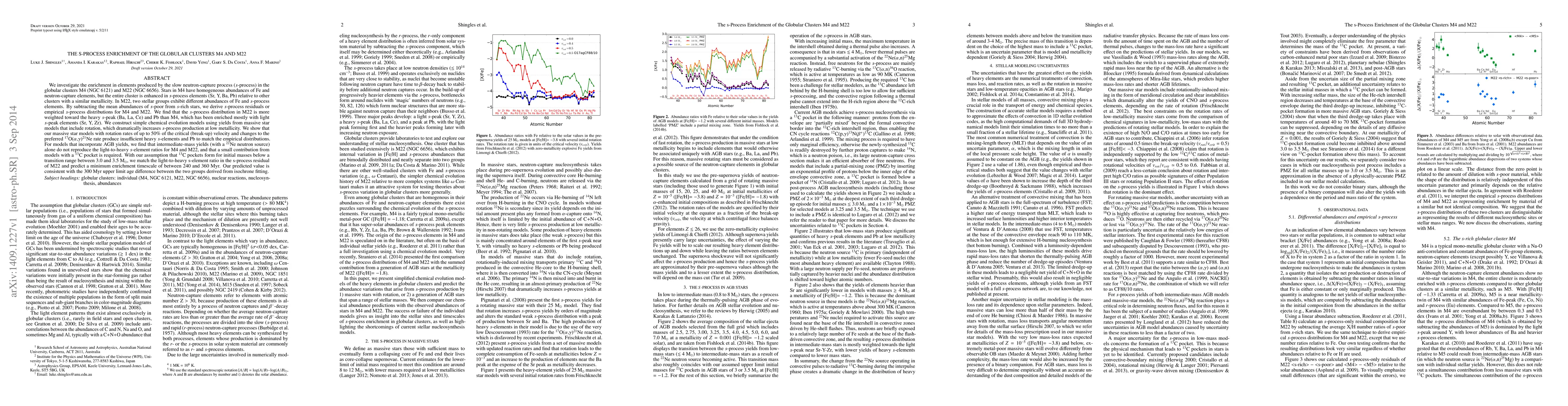 We investigate the enrichment in elements produced by the slow neutron-capture process ($s$-process) in the globular clusters M4 (NGC 6121) and M22 (NGC 6656). Stars in M4 have homogeneous abundances of Fe and neutron-capture elements, but the entire cluster is enhanced in $s$-process elements (Sr, Y, Ba, Pb) relative to other clusters with a similar metallicity. In M22, two stellar groups exhibit different abundances of Fe and $s$-process elements. By subtracting the mean abundances of $s$-poor from $s$-rich stars, we derive $s$-process residuals or empirical $s$-process distributions for M4 and M22. We find that the $s$-process distribution in M22 is more weighted toward the heavy $s$-peak (Ba, La, Ce) and Pb than M4, which has been enriched mostly with light $s$-peak elements (Sr, Y, Zr). We construct simple chemical evolution models using yields from massive star models that include rotation, which dramatically increases $s$-process production at low metallicity. We show that our massive star models with rotation rates of up to 50\% of the critical (break-up) velocity and changes to the preferred $^{17}$O($\alpha$,$\gamma$)$^{21}$Ne rate produce insufficient heavy $s$-elements and Pb to match the empirical distributions. For models that incorporate AGB yields, we find that intermediate-mass yields (with a $^{22}$Ne neutron source) alone do not reproduce the light-to-heavy $s$-element ratios for M4 and M22, and that a small contribution from models with a $^{13}$C pocket is required. With our assumption that $^{13}$C pockets form for initial masses below a transition range between 3.0 and 3.5 M$_\odot$, we match the light-to-heavy s-element ratio in the s-process residual of M22 and predict a minimum enrichment timescale of between 240 and 360 Myr. Our predicted value is consistent with the 300 Myr upper limit age difference between the two groups derived from isochrone fitting.