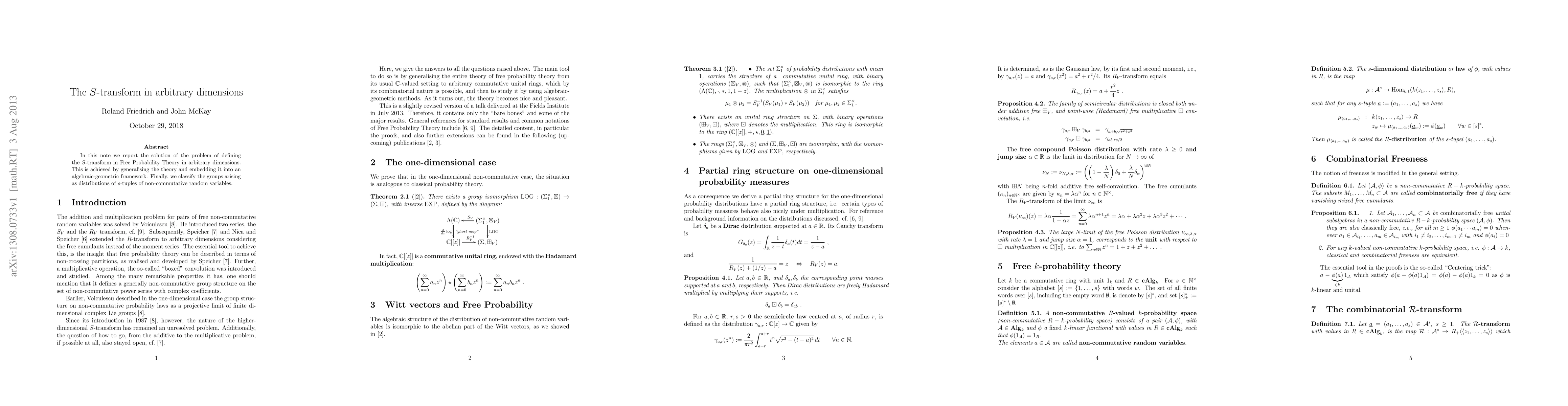 In this note we report the solution of the problem of defining the $S$-transform in Free Probability Theory in arbitrary dimensions. This is achieved by generalising the theory and embedding it into an algebraic-geometric framework. Finally, we classify the groups arising as distributions of s-tuples of non-commutative random variables.