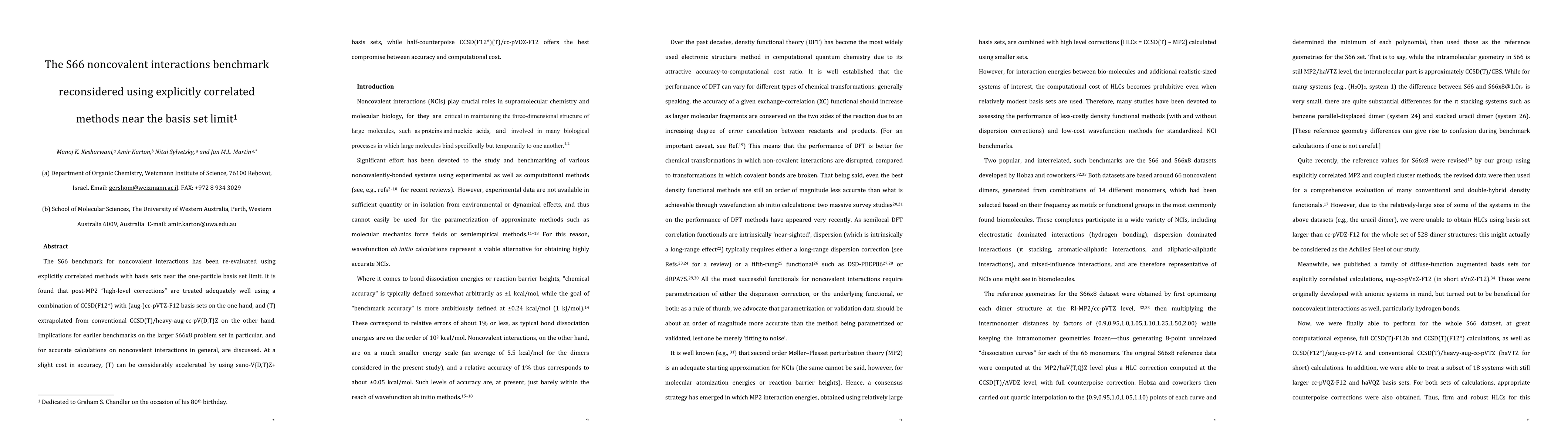 The S66 noncovalent interactions benchmark was re-evaluated using explicitly correlated methods near the basis set limit, specifically CCSD(F12*) and conventional CCSD(T) with basis sets such as (aug-)cc-pVTZ-F12 and heavy-aug-cc-pV{D,T}Z.