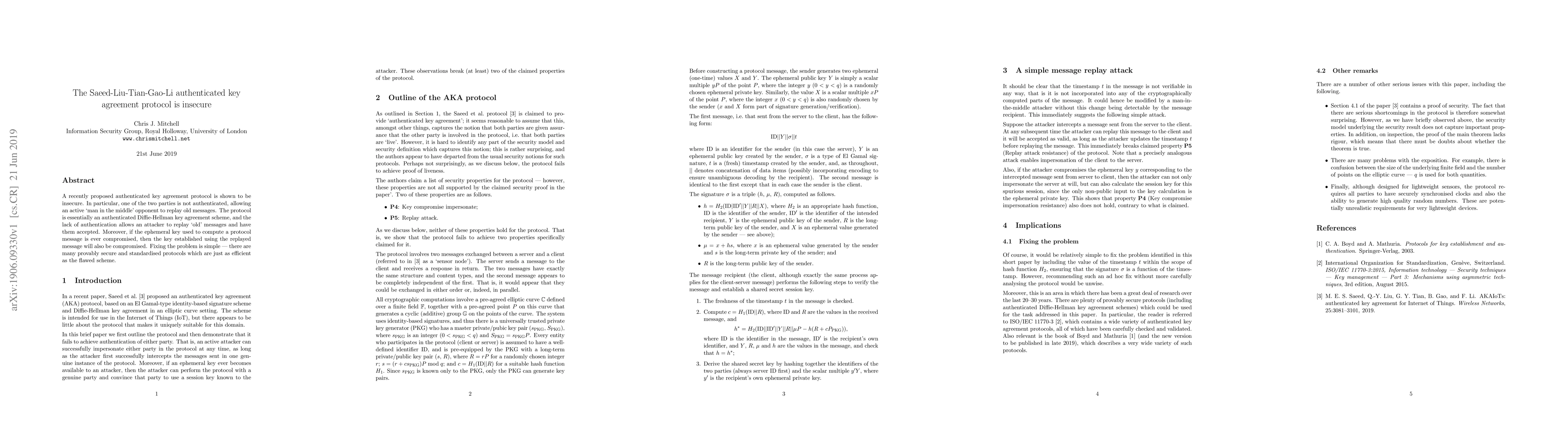 Summary: The Saeed-Liu-Tian-Gao-Li authenticated key agreement protocol is insecure due to lack of full authentication, allowing man-in-the-middle attacks. A simple fix is to adopt existing provably secure, standardized protocols.
