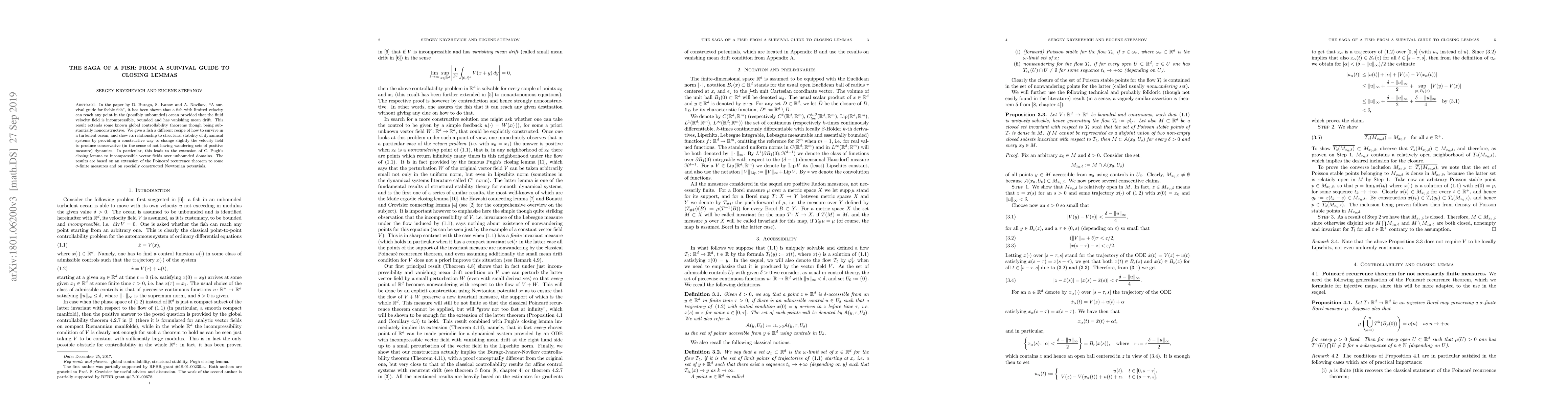 In the paper by D.~Burago, S.~Ivanov and A.~Novikov, "A survival guide for feeble fish", it has been shown that a fish with limited velocity can reach any point in the (possibly unbounded) ocean provided that the fluid velocity field is incompressible, bounded and has vanishing mean drift. This result extends some known global controllability theorems though being substantially nonconstructive. We give a fish a different recipe of how to survive in a turbulent ocean, and show its relationship to structural stability of dynamical systems by providing a constructive way to change slightly the velocity field to produce conservative (in the sense of not having wandering sets of positive measure) dynamics. In particular, this leads to the extension of C.~Pugh's closing lemma to incompressible vector fields over unbounded domains. The results are based on an extension of the Poincar\'{e} recurrence theorem to some $\sigma$-finite measures and on specially constructed Newtonian potentials.