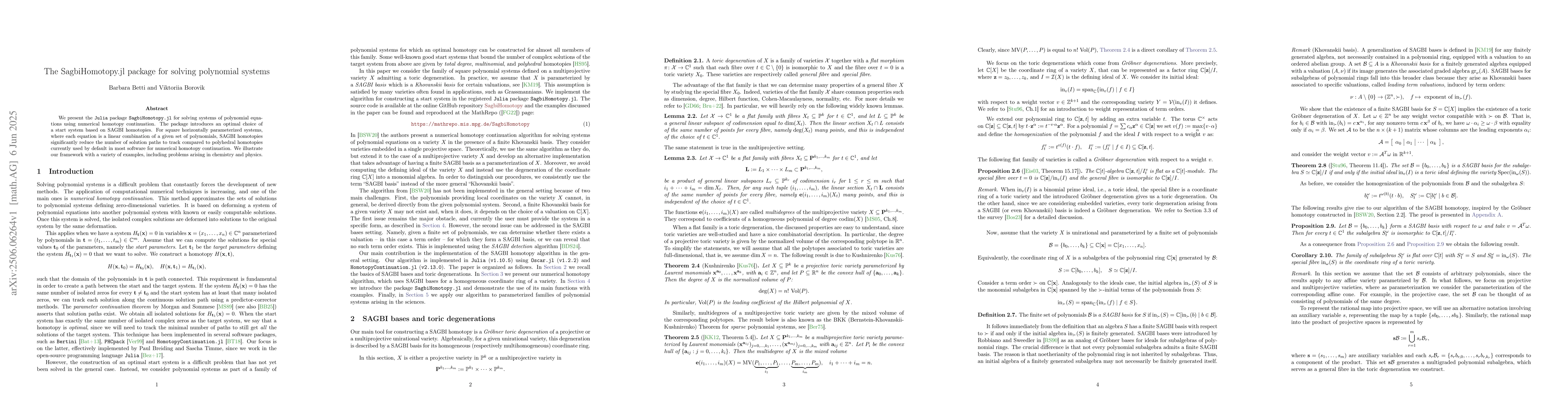 We present the Julia package SagbiHomotopy.jl for solving systems of polynomial equations using numerical homotopy continuation. The package introduces an optimal choice of a start system based on SAGBI homotopies. For square horizontally parameterized systems, where each equation is a linear combination of a given set of polynomials, SAGBI homotopies significantly reduce the number of solution paths to track compared to polyhedral homotopies currently used by default in most software for numerical homotopy continuation. We illustrate our framework with a variety of examples, including problems arising in chemistry and physics.