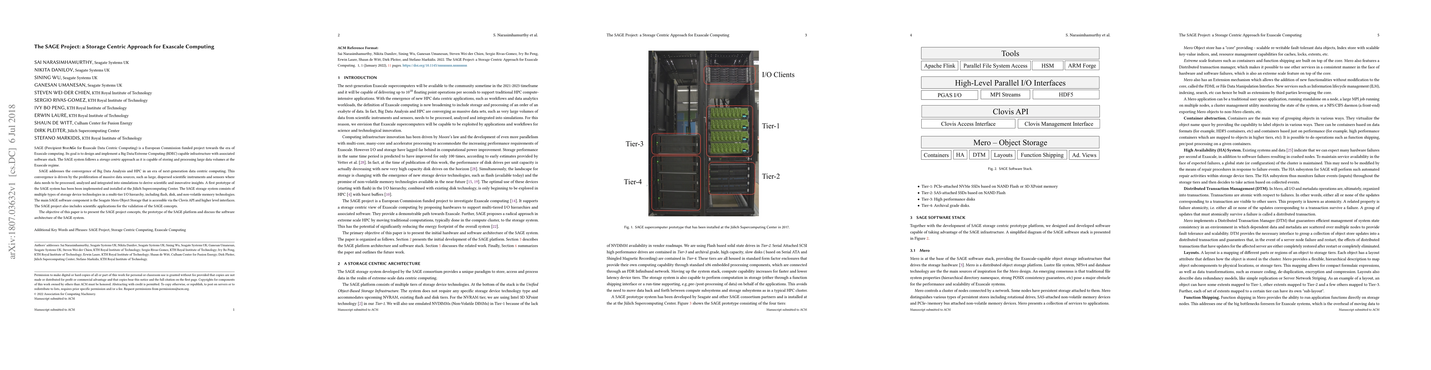 The SAGE Project aims to design a storage-centric infrastructure for Exascale computing, integrating Big Data Analysis and High-Performance Computing. A prototype has been implemented at the Julich Supercomputing Center, featuring a multi-tier storage system and the Seagate Mero Object Storage with the Clovis API.