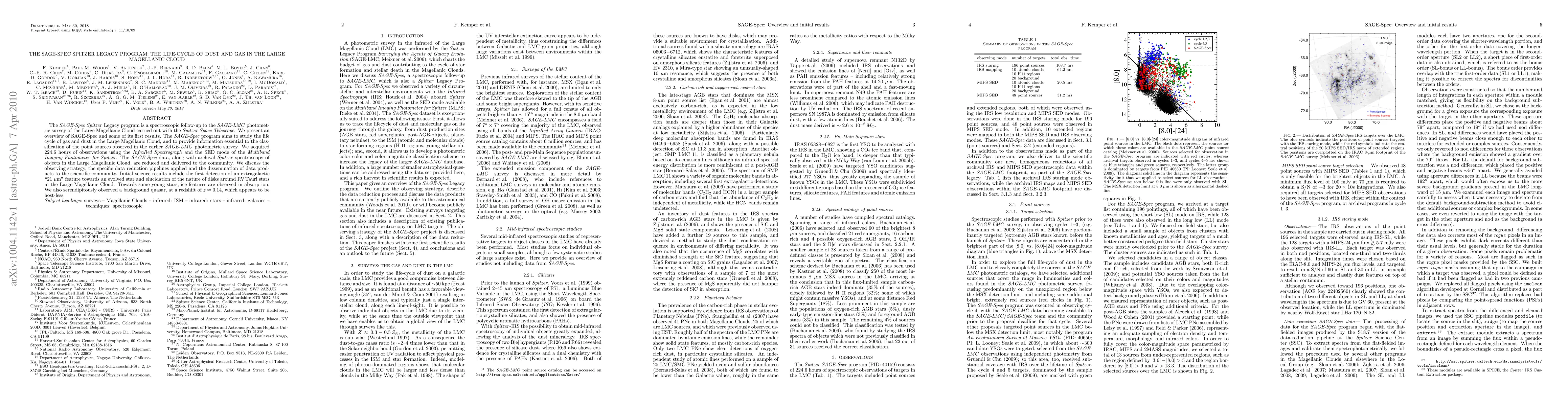 The SAGE-Spec Spitzer Legacy program investigates the life cycle of gas and dust in the Large Magellanic Cloud using Spitzer Space Telescope data, revealing the first extragalactic "21 um" feature and the nature of disks around RV Tauri stars. The program also discovered an unusual host-less background quasar.