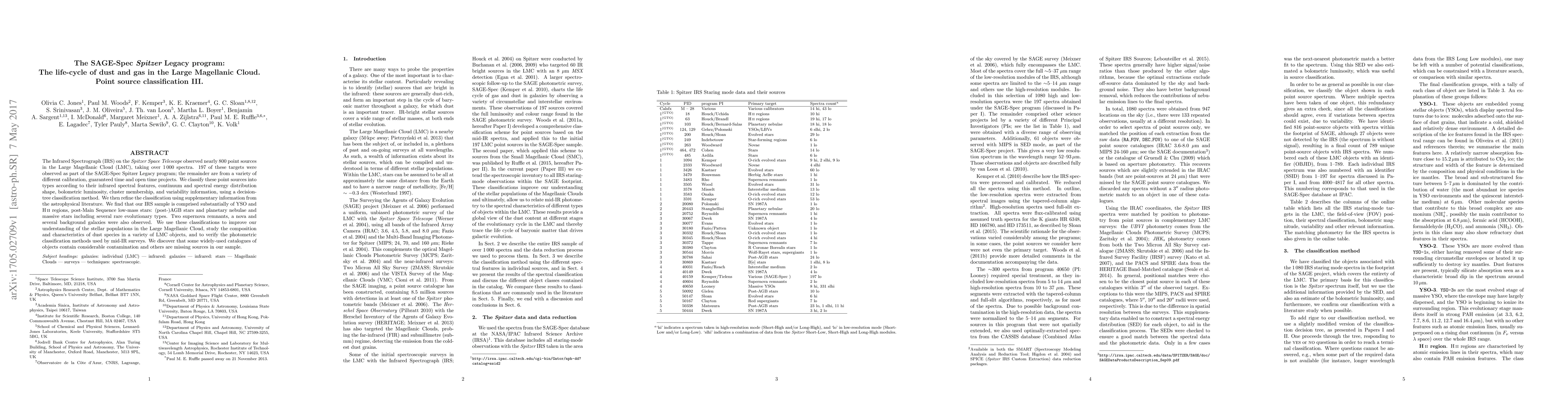 The SAGE-Spec Spitzer Legacy program classified nearly 800 point sources in the Large Magellanic Cloud using Spitzer's IRS, identifying YSOs, H\,{\sc ii} regions, post-AGB stars, and other stellar types. This classification enhances understanding of LMC stellar populations and dust composition.