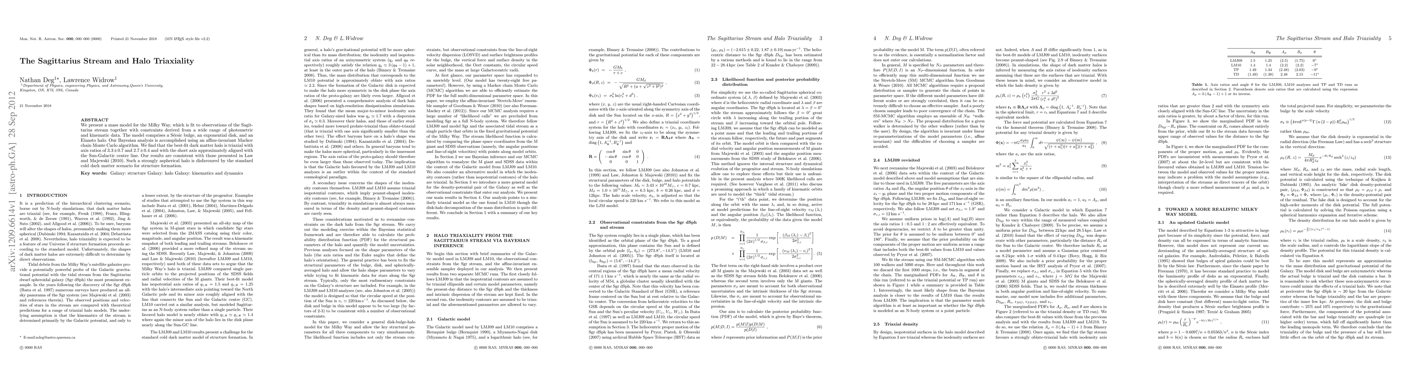 We present a mass model for the Milky Way, which is fit to observations of the Sagittarius stream together with constraints derived from a wide range of photometric and kinematic data. The model comprises a S\'{e}rsic bulge, an exponential disk, and an Einasto halo. Our Bayesian analysis is accomplished using an affine-invariant Markov chain Monte Carlo algorithm. We find that the best-fit dark matter halo is triaxial with axis ratios of $3.3\pm 0.7$ and $2.7\pm 0.4$ and with the short axis approximately aligned with the Sun-Galactic centre line. Our results are consistent with those presented in Law and Majewski (2010). Such a strongly aspherical halo is disfavoured by the standard cold dark matter scenario for structure formation.
