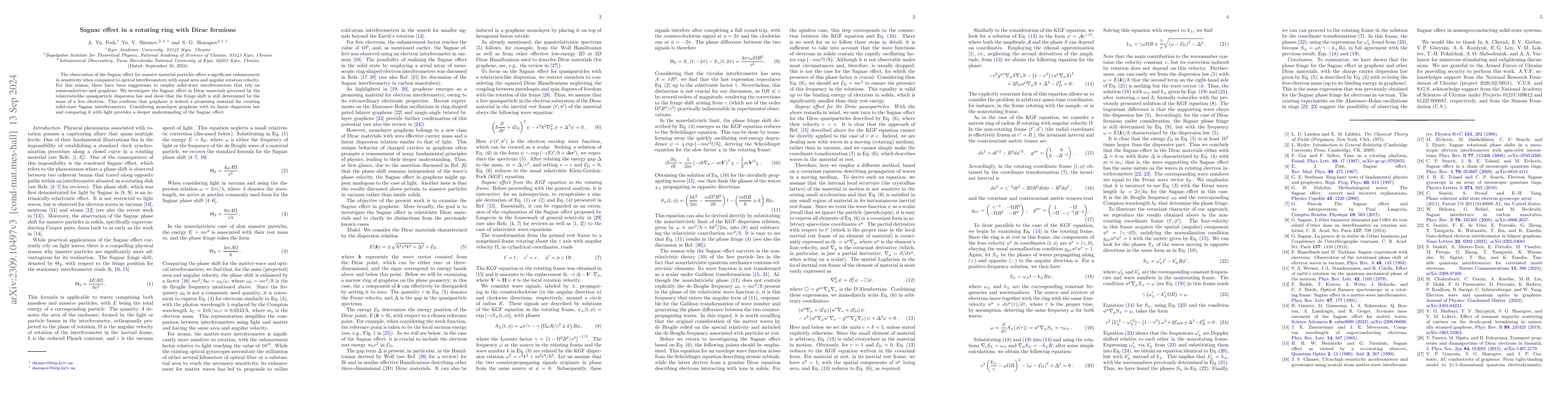 The observation of the Sagnac effect for massive material particles offers a significant enhancement in sensitivity when compared to optical interferometers with equal area and angular rotation velocity. As a result, there have been suggestions to employ solid-state interferometers that rely on semiconductors and graphene. However, in the case of monolayer graphene, its quasiparticles exhibit a linear dispersion, thus making the Sagnac effect in graphene comparable to that of for light. We investigate the Sagnac effect in the Dirac materials governed by the relativistic dispersion law and find the value of the fringe shift. The analysis reveals that optimal sensitivity is achieved in materials featuring a reduced value of Fermi velocity. Notably, the sign of the fringe shift depends on the nature of the charge carriers -- whether they are electrons or holes.