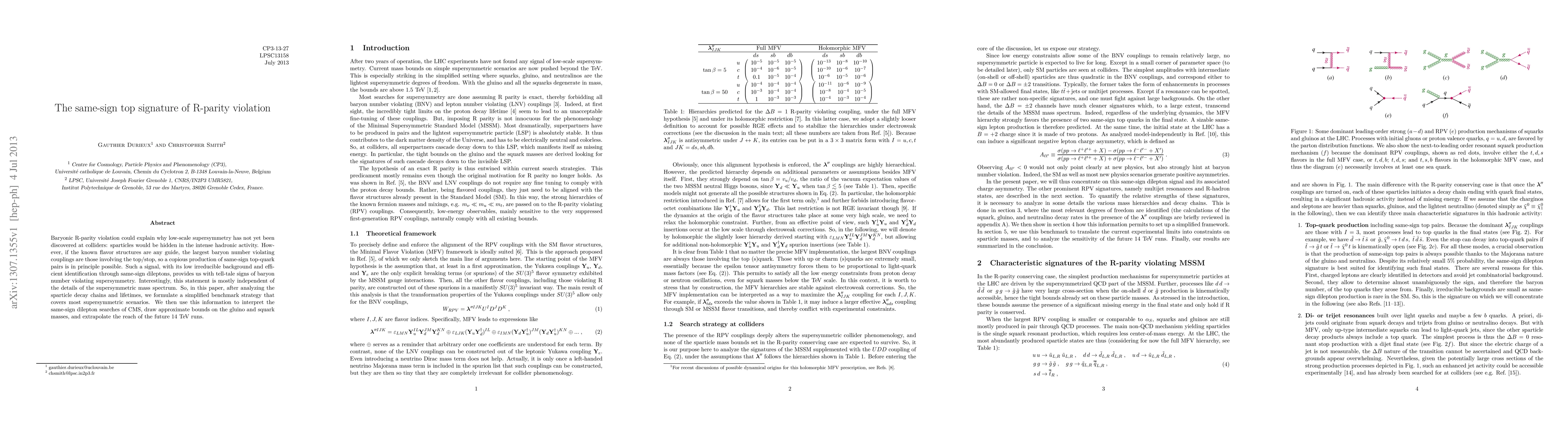 Baryonic R-parity violation could explain why low-scale supersymmetry has not yet been discovered at colliders: sparticles would be hidden in the intense hadronic activity. However, if the known flavor structures are any guide, the largest baryon number violating couplings are those involving the top/stop, so a copious production of same-sign top-quark pairs is in principle possible. Such a signal, with its low irreducible background and efficient identification through same-sign dileptons, provides us with tell-tale signs of baryon number violating supersymmetry. Interestingly, this statement is mostly independent of the details of the supersymmetric mass spectrum. So, in this paper, after analyzing the sparticle decay chains and lifetimes, we formulate a simplified benchmark strategy that covers most supersymmetric scenarios. We then use this information to interpret the same-sign dilepton searches of CMS, draw approximate bounds on the gluino and squark masses, and extrapolate the reach of the future 14 TeV runs.