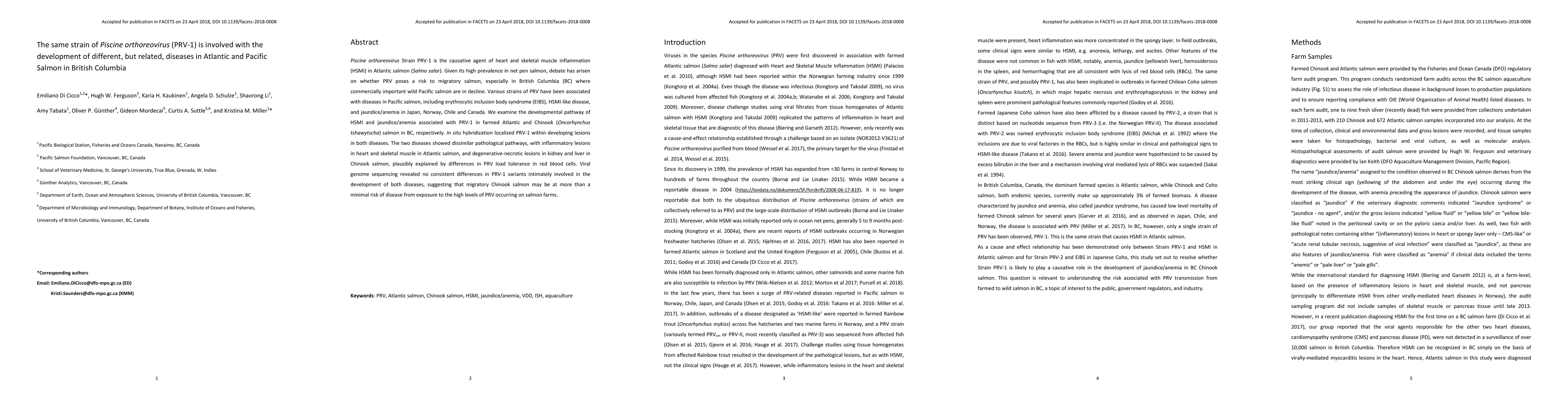 This study identifies Piscine orthoreovirus Strain PRV-1 as the causative agent of both heart and skeletal muscle inflammation in Atlantic salmon and jaundice/anemia in Chinook salmon in British Columbia. Despite different pathological pathways, genomic analysis shows no consistent differences between PRV-1 variants linked to these diseases, indicating potential high-risk exposure for wild migratory Chinook salmon.