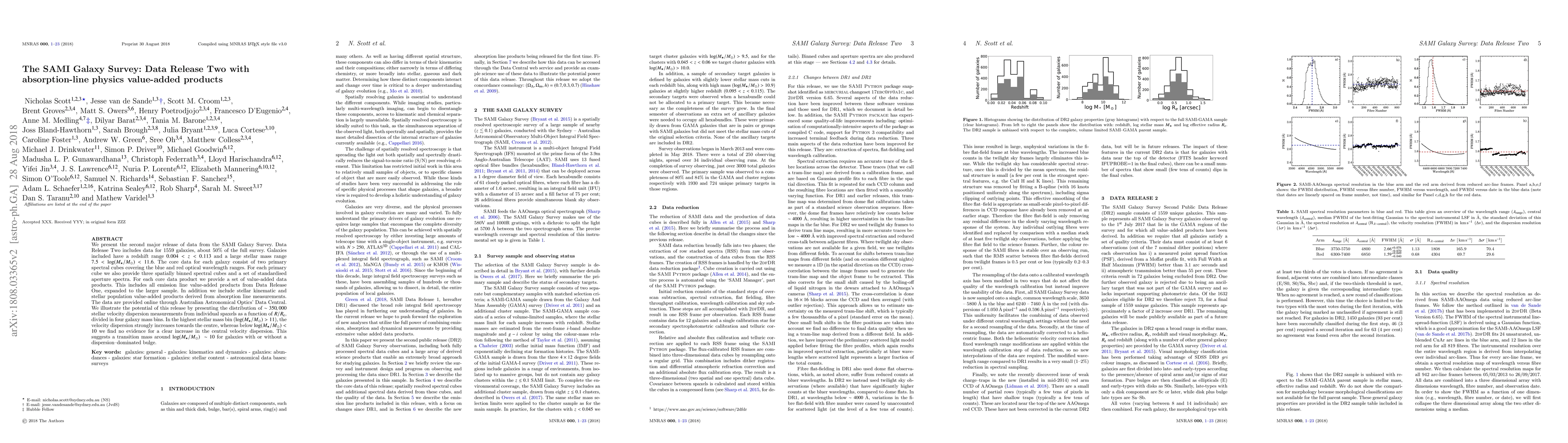 The SAMI Galaxy Survey's Data Release Two presents data for 1559 galaxies, including spectral cubes and value-added products derived from absorption lines, revealing a transition mass around log (M_star/M_sun) ~10 for galaxies with dispersion-dominated bulges.