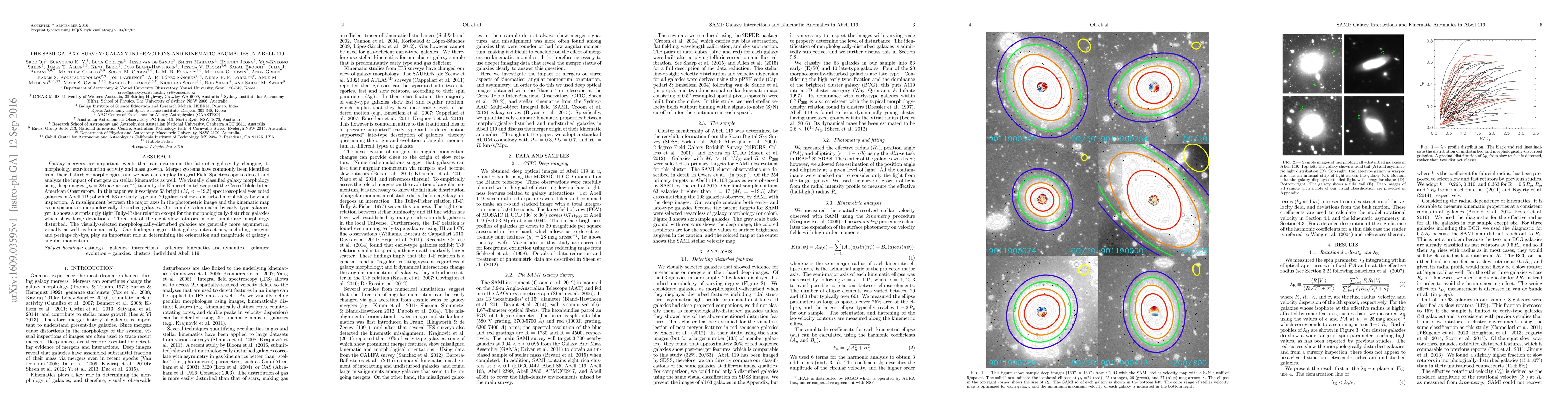 Galaxy mergers are important events that can determine the fate of a galaxy by changing its morphology, star-formation activity and mass growth. Merger systems have commonly been identified from their disturbed morphologies, and we now can employ Integral Field Spectroscopy to detect and analyze the impact of mergers on stellar kinematics as well. We visually classified galaxy morphology using deep images ($\mu_{\rm r} = 28\,\rm mag\,\, arcsec^{-2}$) taken by the Blanco 4-m telescope at the Cerro Tololo Inter-American Observatory. In this paper we investigate 63 bright ($M_{\rm r}<-19.3$) spectroscopically-selected galaxies in Abell 119; of which 53 are early type and 20 galaxies show a disturbed morphology by visual inspection. A misalignment between the major axes in the photometric image and the kinematic map is conspicuous in morphologically-disturbed galaxies. Our sample is dominated by early-type galaxies, yet it shows a surprisingly tight Tully-Fisher relation except for the morphologically-disturbed galaxies which show large deviations. Three out of the eight slow rotators in our sample are morphology disturbed. The visually-selected morphologically-disturbed galaxies are generally more asymmetric, visually as well as kinematically. Our findings suggest that galaxy interactions, including mergers and perhaps fly-bys, play an important role in determining the orientation and magnitude of galaxy's angular momentum.