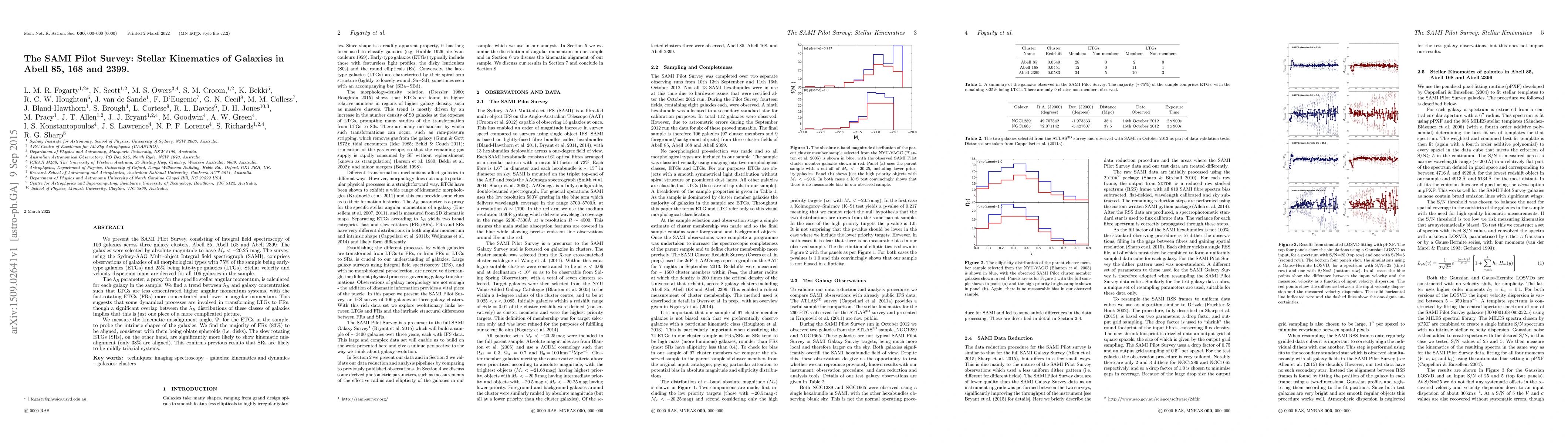 The SAMI Pilot Survey investigates the stellar kinematics of 106 galaxies across three clusters, revealing a trend between specific angular momentum and galaxy concentration, with late-type galaxies showing higher angular momentum and fast-rotating early-type galaxies being more concentrated. Most fast-rotating early-type galaxies are aligned, suggesting oblate spheroidal shapes.