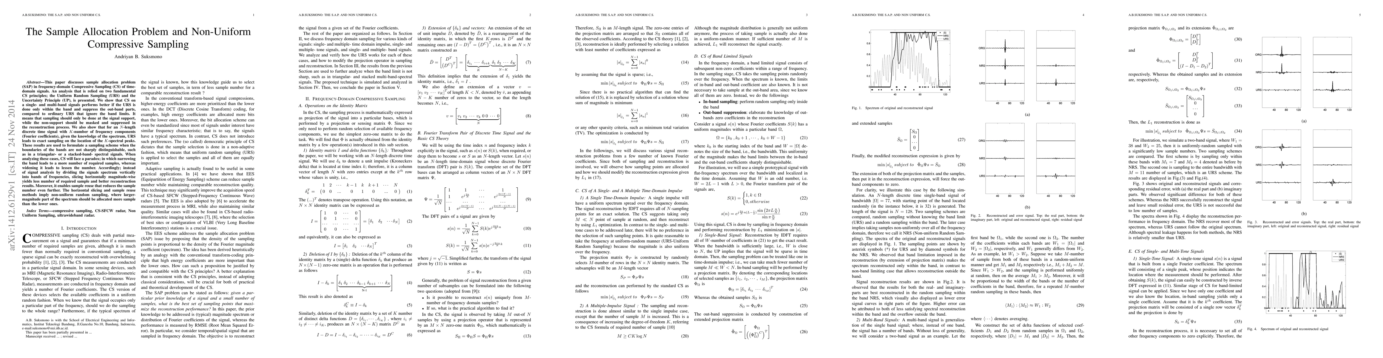 This paper discusses sample allocation problem (SAP) in frequency-domain Compressive Sampling (CS) of time-domain signals. An analysis that is relied on two fundamental CS principles; the Uniform Random Sampling (URS) and the Uncertainty Principle (UP), is presented. We show that CS on a single- and multi-band signals performs better if the URS is done only within the band and suppress the out-band parts, compared to ordinary URS that ignore the band limits. It means that sampling should only be done at the signal support, while the non-support should be masked and suppressed in the reconstruction process. We also show that for an N-length discrete time signal with K-number of frequency components (Fourier coefficients), given the knowledge of the spectrum, URS leads to exact sampling on the location of the K-spectral peaks. These results are used to formulate a sampling scheme when the boundaries of the bands are not sharply distinguishable, such as in a triangular- or a stacked-band- spectral signals. When analyzing these cases, CS will face a paradox; in which narrowing the band leads to a more number of required samples, whereas widening it leads to lessen the number. Accordingly; instead of signal analysis by dividing the signal's spectrum vertically into bands of frequencies, slicing horizontally magnitude-wise yields less number of required sample and better reconstruction results. Moreover, it enables sample reuse that reduces the sample number even further. The horizontal slicing and sample reuse methods imply non-uniform random sampling, where larger-magnitude part of the spectrum should be allocated more sample than the lower ones.