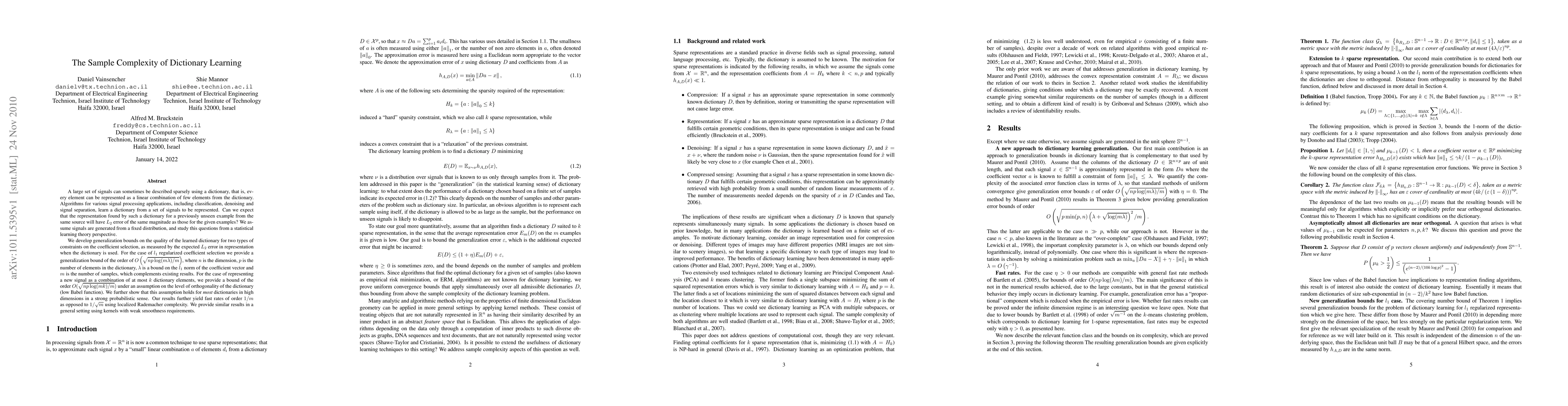 A large set of signals can sometimes be described sparsely using a dictionary, that is, every element can be represented as a linear combination of few elements from the dictionary. Algorithms for various signal processing applications, including classification, denoising and signal separation, learn a dictionary from a set of signals to be represented. Can we expect that the representation found by such a dictionary for a previously unseen example from the same source will have L_2 error of the same magnitude as those for the given examples? We assume signals are generated from a fixed distribution, and study this questions from a statistical learning theory perspective. We develop generalization bounds on the quality of the learned dictionary for two types of constraints on the coefficient selection, as measured by the expected L_2 error in representation when the dictionary is used. For the case of l_1 regularized coefficient selection we provide a generalization bound of the order of O(sqrt(np log(m lambda)/m)), where n is the dimension, p is the number of elements in the dictionary, lambda is a bound on the l_1 norm of the coefficient vector and m is the number of samples, which complements existing results. For the case of representing a new signal as a combination of at most k dictionary elements, we provide a bound of the order O(sqrt(np log(m k)/m)) under an assumption on the level of orthogonality of the dictionary (low Babel function). We further show that this assumption holds for most dictionaries in high dimensions in a strong probabilistic sense. Our results further yield fast rates of order 1/m as opposed to 1/sqrt(m) using localized Rademacher complexity. We provide similar results in a general setting using kernels with weak smoothness requirements.