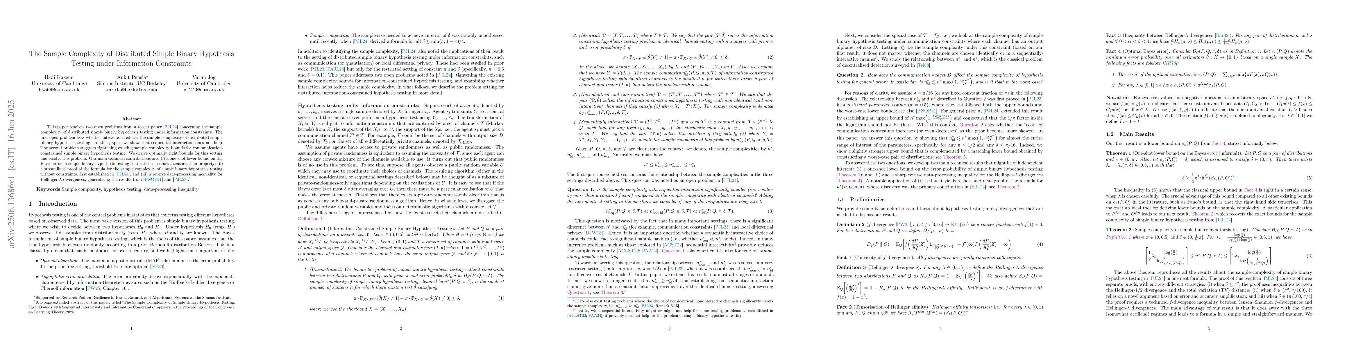 This paper resolves two open problems from a recent paper, arXiv:2403.16981, concerning the sample complexity of distributed simple binary hypothesis testing under information constraints. The first open problem asks whether interaction reduces the sample complexity of distributed simple binary hypothesis testing. In this paper, we show that sequential interaction does not help. The second problem suggests tightening existing sample complexity bounds for communication-constrained simple binary hypothesis testing. We derive optimally tight bounds for this setting and resolve this problem. Our main technical contributions are: (i) a one-shot lower bound on the Bayes error in simple binary hypothesis testing that satisfies a crucial tensorisation property; (ii) a streamlined proof of the formula for the sample complexity of simple binary hypothesis testing without constraints, first established in arXiv:2403.16981; and (iii) a reverse data-processing inequality for Hellinger-$\lambda$ divergences, generalising the results from arXiv:1812.03031 and arXiv:2206.02765.