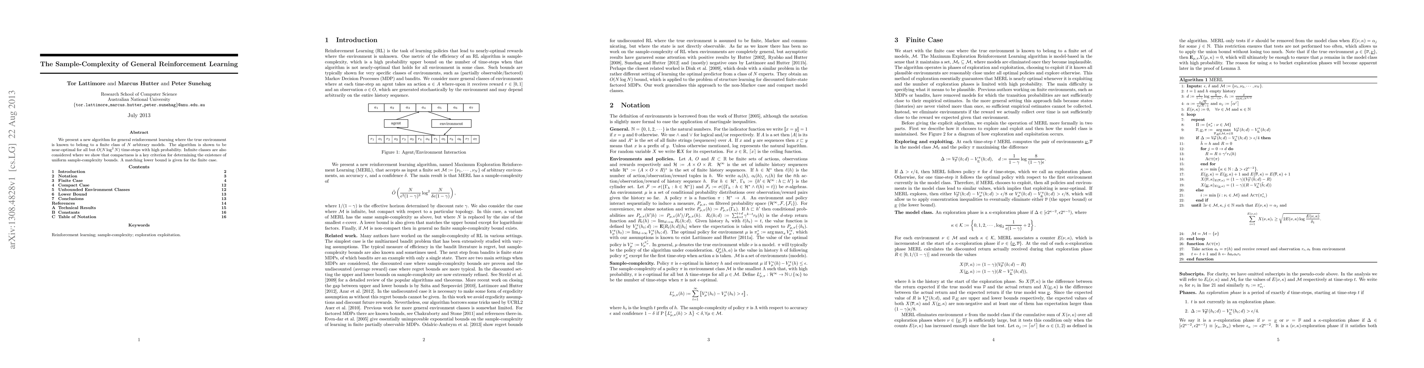 We present a new algorithm for general reinforcement learning where the true environment is known to belong to a finite class of N arbitrary models. The algorithm is shown to be near-optimal for all but O(N log^2 N) time-steps with high probability. Infinite classes are also considered where we show that compactness is a key criterion for determining the existence of uniform sample-complexity bounds. A matching lower bound is given for the finite case.