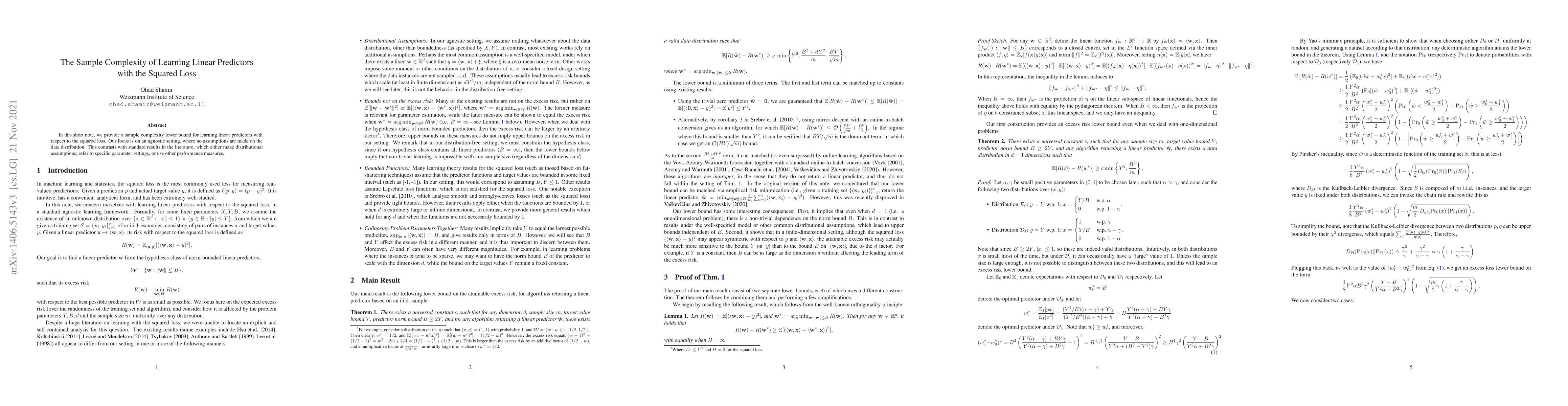 This paper sets a sample complexity lower bound for learning linear predictors with squared loss in an agnostic setting without distributional assumptions. It provides a new benchmark for comparing the performance of different learning algorithms.