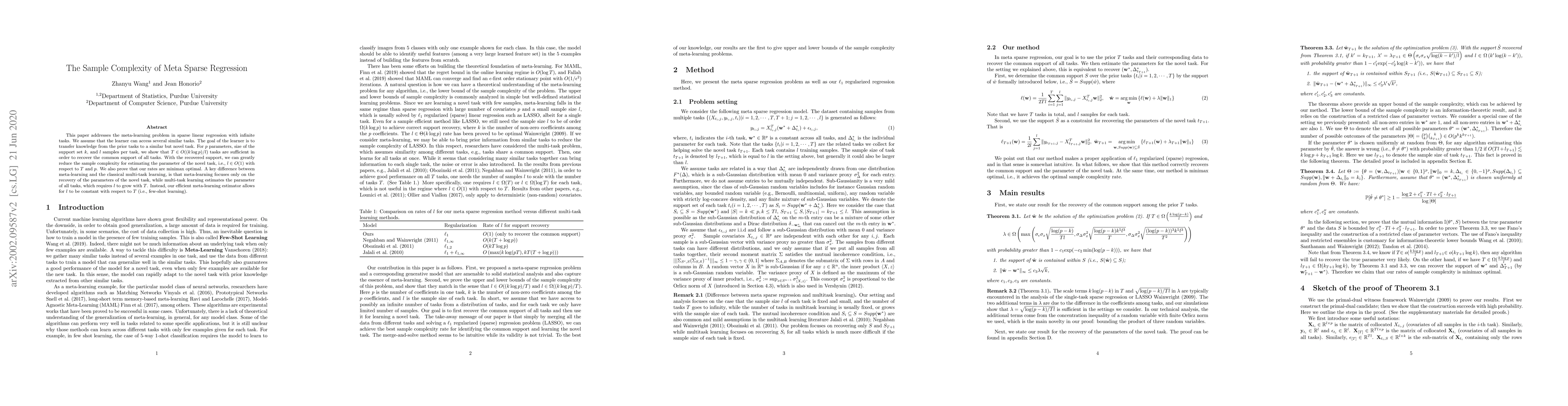 This paper addresses the meta-learning problem in sparse linear regression with infinite tasks. We assume that the learner can access several similar tasks. The goal of the learner is to transfer knowledge from the prior tasks to a similar but novel task. For p parameters, size of the support set k , and l samples per task, we show that T \in O (( k log(p) ) /l ) tasks are sufficient in order to recover the common support of all tasks. With the recovered support, we can greatly reduce the sample complexity for estimating the parameter of the novel task, i.e., l \in O (1) with respect to T and p . We also prove that our rates are minimax optimal. A key difference between meta-learning and the classical multi-task learning, is that meta-learning focuses only on the recovery of the parameters of the novel task, while multi-task learning estimates the parameter of all tasks, which requires l to grow with T . Instead, our efficient meta-learning estimator allows for l to be constant with respect to T (i.e., few-shot learning).