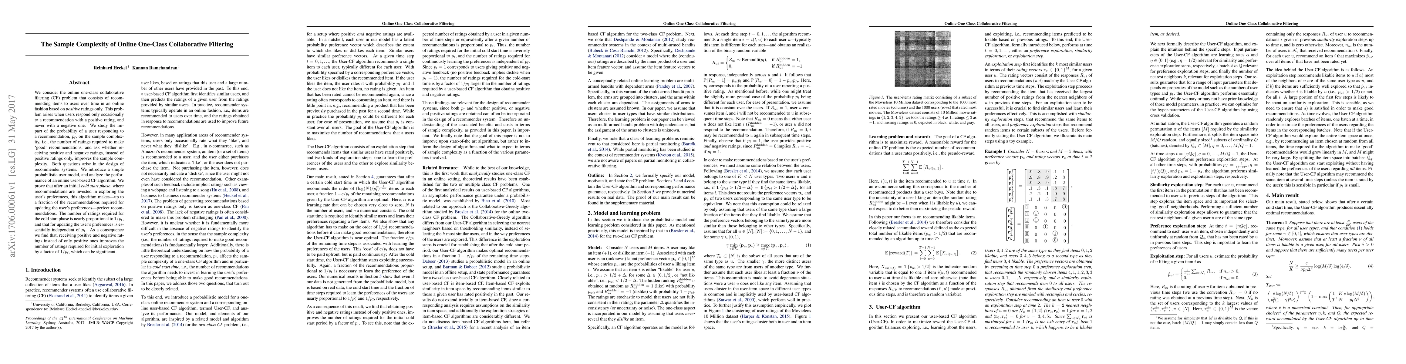 We consider the online one-class collaborative filtering (CF) problem that consists of recommending items to users over time in an online fashion based on positive ratings only. This problem arises when users respond only occasionally to a recommendation with a positive rating, and never with a negative one. We study the impact of the probability of a user responding to a recommendation, p_f, on the sample complexity, i.e., the number of ratings required to make `good' recommendations, and ask whether receiving positive and negative ratings, instead of positive ratings only, improves the sample complexity. Both questions arise in the design of recommender systems. We introduce a simple probabilistic user model, and analyze the performance of an online user-based CF algorithm. We prove that after an initial cold start phase, where recommendations are invested in exploring the user's preferences, this algorithm makes---up to a fraction of the recommendations required for updating the user's preferences---perfect recommendations. The number of ratings required for the cold start phase is nearly proportional to 1/p_f, and that for updating the user's preferences is essentially independent of p_f. As a consequence we find that, receiving positive and negative ratings instead of only positive ones improves the number of ratings required for initial exploration by a factor of 1/p_f, which can be significant.