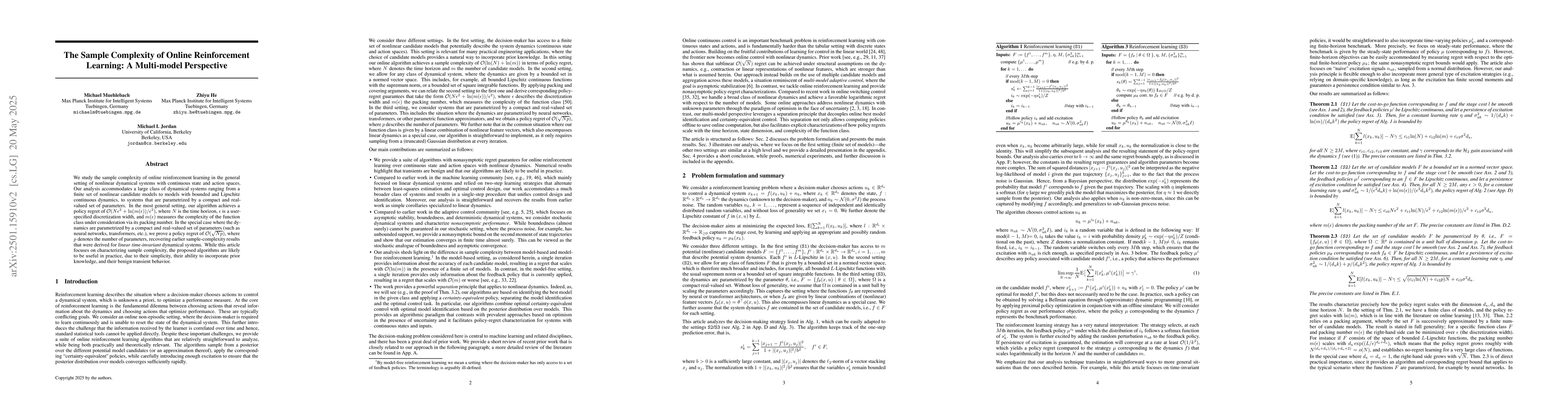 This paper investigates the sample complexity of online reinforcement learning for nonlinear systems with continuous state and action spaces. It provides algorithms achieving optimal regret bounds across various model classes, including neural networks, and highlights practical benefits like simplicity and prior knowledge incorporation.