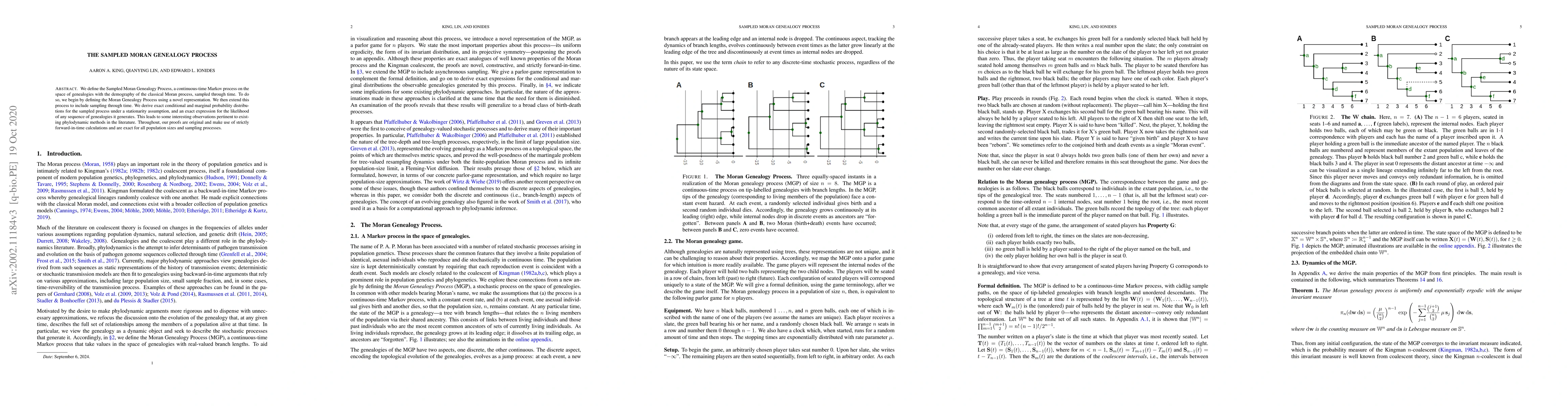 The paper introduces the Sampled Moran Genealogy Process, a continuous-time Markov process that extends the classical Moran process by incorporating temporal sampling. It provides exact probability distributions and likelihood expressions for the sampled genealogies, offering insights into phylodynamic methods.