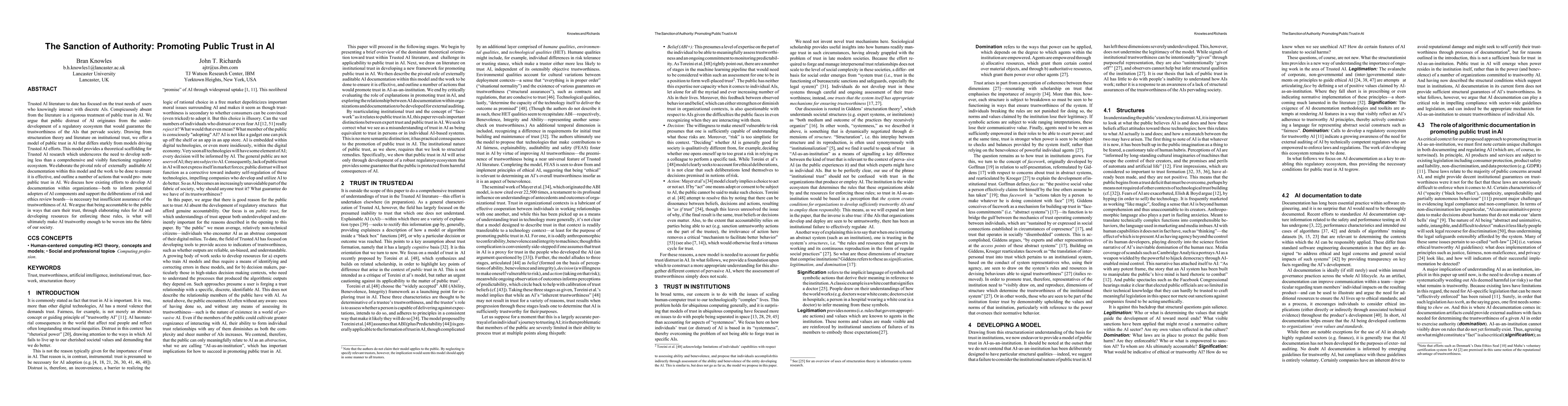 Trusted AI literature to date has focused on the trust needs of users who knowingly interact with discrete AIs. Conspicuously absent from the literature is a rigorous treatment of public trust in AI. We argue that public distrust of AI originates from the under-development of a regulatory ecosystem that would guarantee the trustworthiness of the AIs that pervade society. Drawing from structuration theory and literature on institutional trust, we offer a model of public trust in AI that differs starkly from models driving Trusted AI efforts. This model provides a theoretical scaffolding for Trusted AI research which underscores the need to develop nothing less than a comprehensive and visibly functioning regulatory ecosystem. We elaborate the pivotal role of externally auditable AI documentation within this model and the work to be done to ensure it is effective, and outline a number of actions that would promote public trust in AI. We discuss how existing efforts to develop AI documentation within organizations -- both to inform potential adopters of AI components and support the deliberations of risk and ethics review boards -- is necessary but insufficient assurance of the trustworthiness of AI. We argue that being accountable to the public in ways that earn their trust, through elaborating rules for AI and developing resources for enforcing these rules, is what will ultimately make AI trustworthy enough to be woven into the fabric of our society.