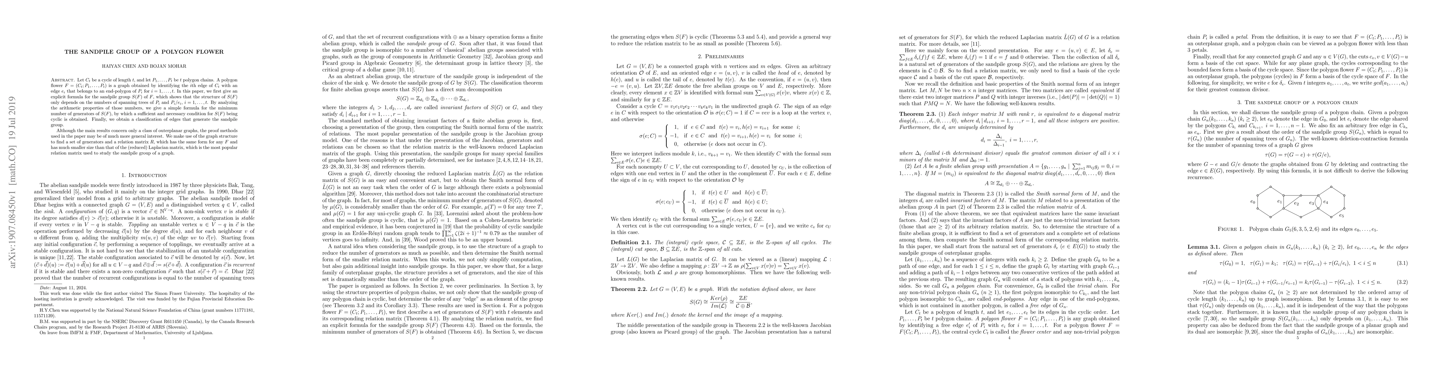 The paper studies the sandpile group of a polygon flower graph, finding that its structure depends only on the number of spanning trees in individual chains and deriving a formula for the minimum number of generators needed to classify edges.