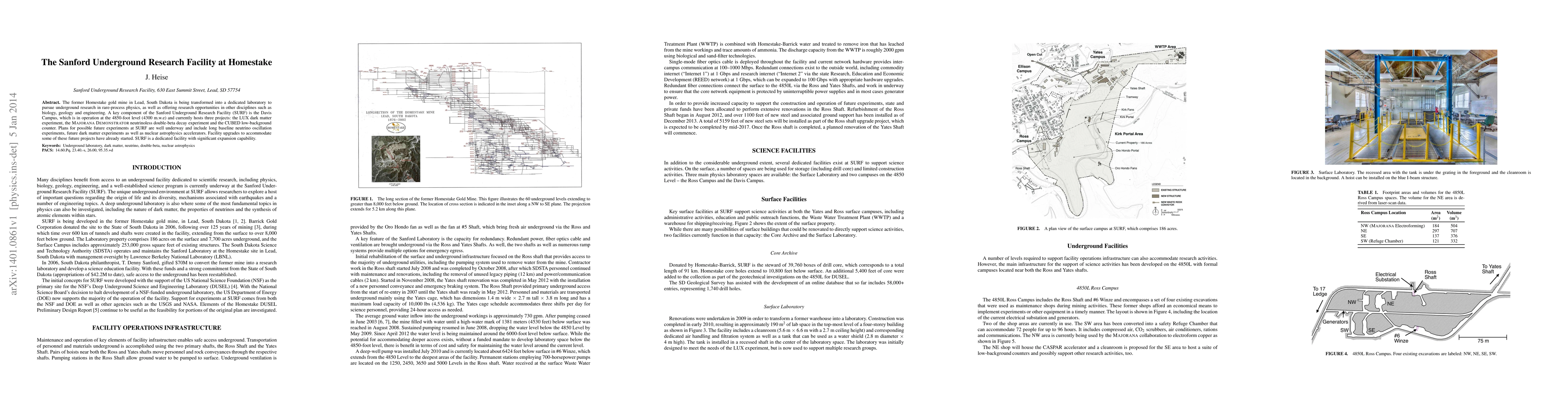 The Sanford Underground Research Facility (SURF) at the former Homestake gold mine in South Dakota is a dedicated laboratory for rare-process physics research, currently hosting experiments like LUX and MAJORANA, with plans for future neutrino and dark matter studies. The facility has significant expansion potential.