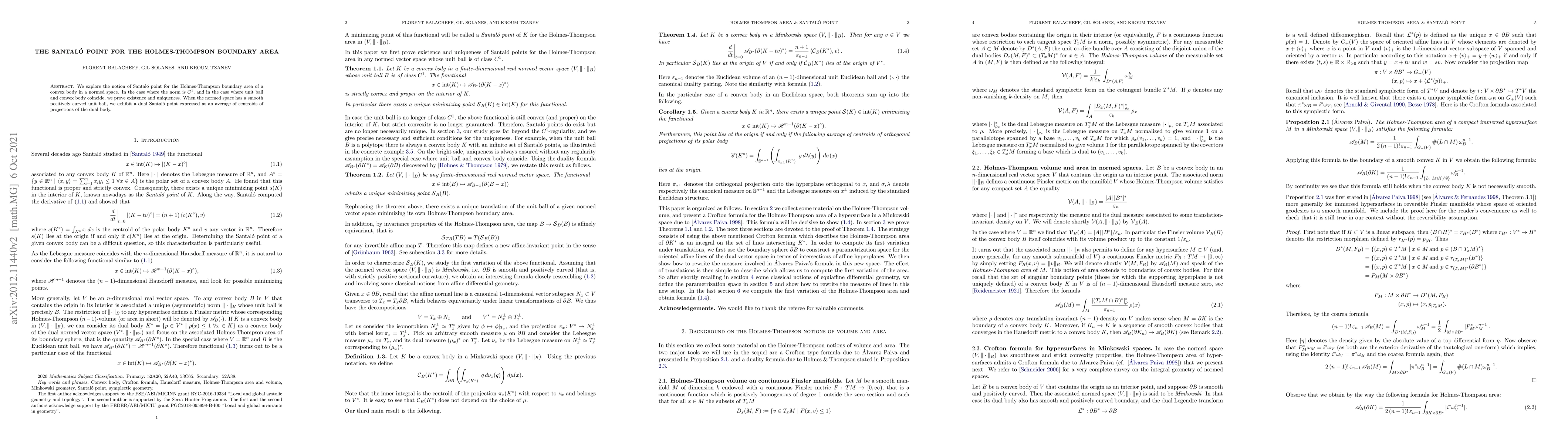 This paper investigates the Santal'o point for the Holmes-Thompson boundary area of a convex body in a normed space, proving its existence and uniqueness under $C^1$ norm conditions. It also introduces a dual Santal'o point in smooth, positively curved unit balls, expressed as an average of centroids of projections of the dual body.