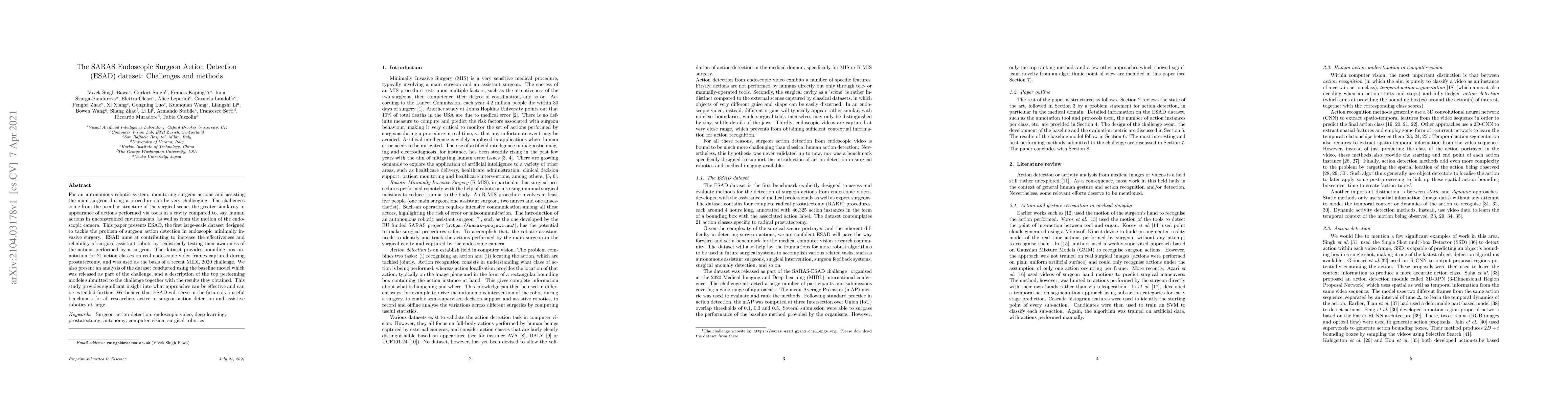 For an autonomous robotic system, monitoring surgeon actions and assisting the main surgeon during a procedure can be very challenging. The challenges come from the peculiar structure of the surgical scene, the greater similarity in appearance of actions performed via tools in a cavity compared to, say, human actions in unconstrained environments, as well as from the motion of the endoscopic camera. This paper presents ESAD, the first large-scale dataset designed to tackle the problem of surgeon action detection in endoscopic minimally invasive surgery. ESAD aims at contributing to increase the effectiveness and reliability of surgical assistant robots by realistically testing their awareness of the actions performed by a surgeon. The dataset provides bounding box annotation for 21 action classes on real endoscopic video frames captured during prostatectomy, and was used as the basis of a recent MIDL 2020 challenge. We also present an analysis of the dataset conducted using the baseline model which was released as part of the challenge, and a description of the top performing models submitted to the challenge together with the results they obtained. This study provides significant insight into what approaches can be effective and can be extended further. We believe that ESAD will serve in the future as a useful benchmark for all researchers active in surgeon action detection and assistive robotics at large.
